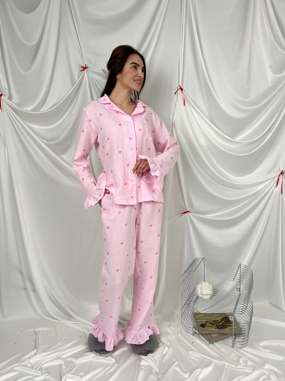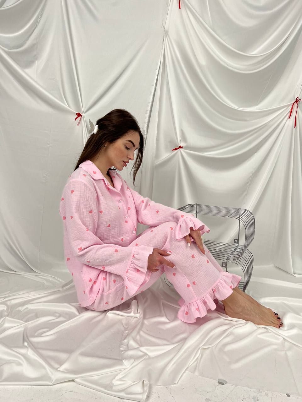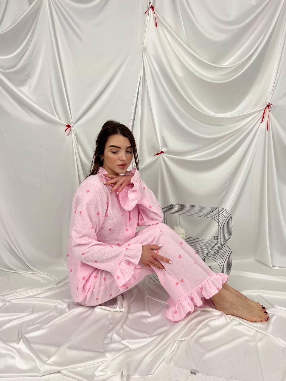 Муслінова жіноча піжама (сорочка та штани) з рюшами 185-24 в рожеві сердечка