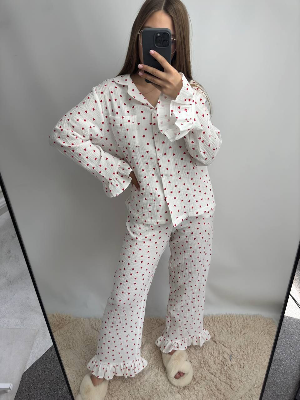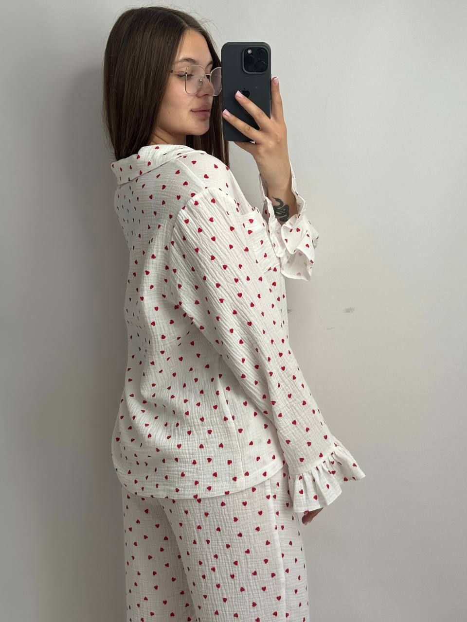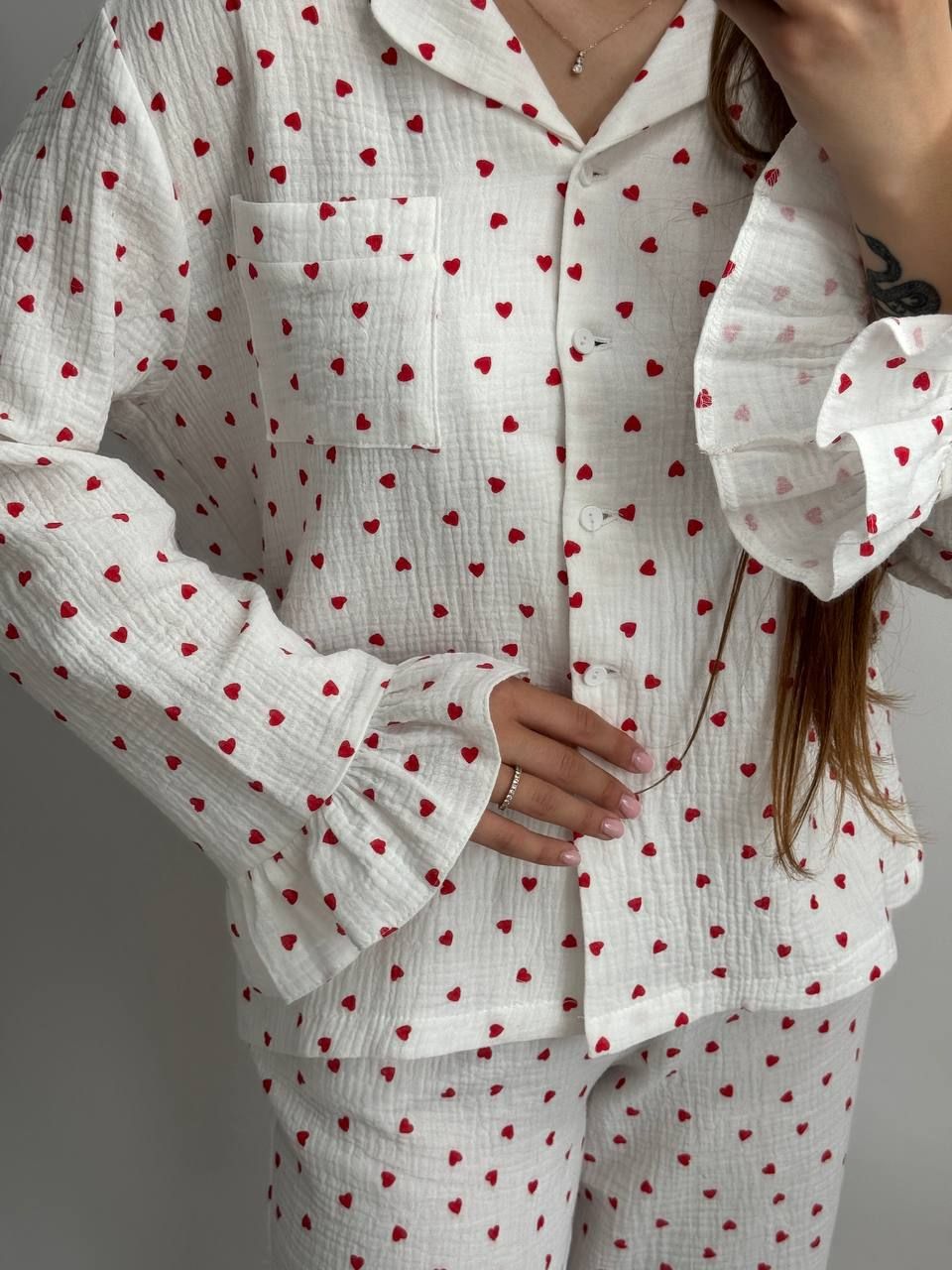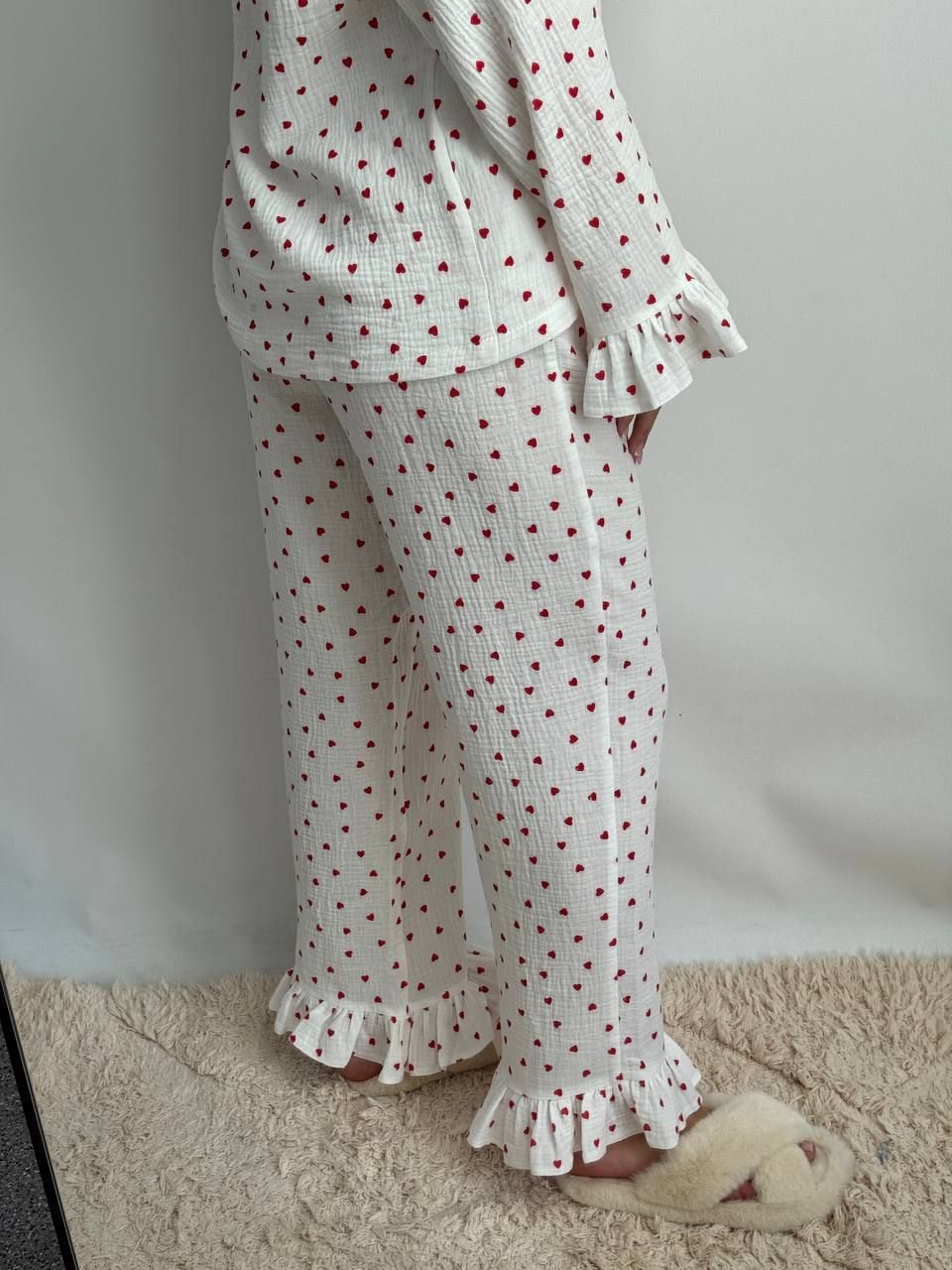Муслінова жіноча піжама (сорочка та штани) з рюшами 185-24 в червоні сердечка