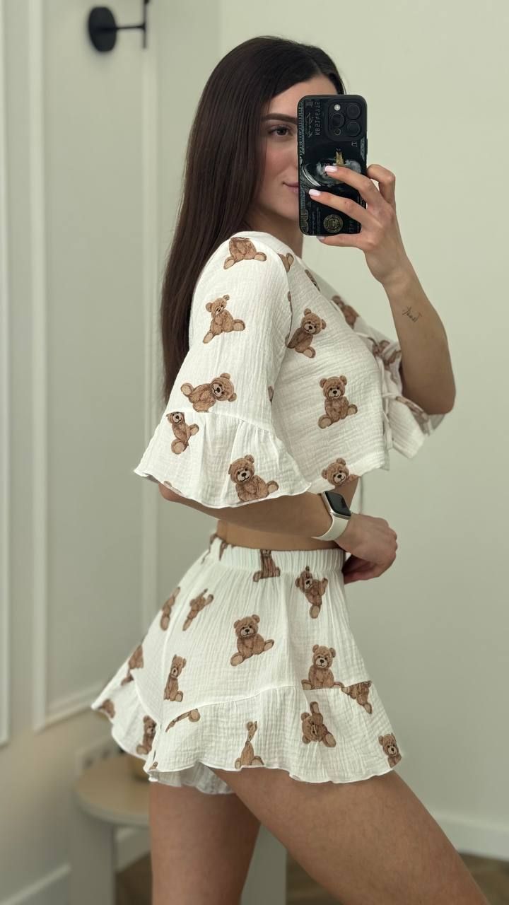 Набір з мусліну – це ідеальний варіант для тих, хто цінує легкість і комфорт. Комплект складається з укороченої кофти на зав'язках, що дозволяє регулювати посадку і додає образу нотку ніжності. Рукавчики прикрашені делікатною рюшею, яка додає романтичності.