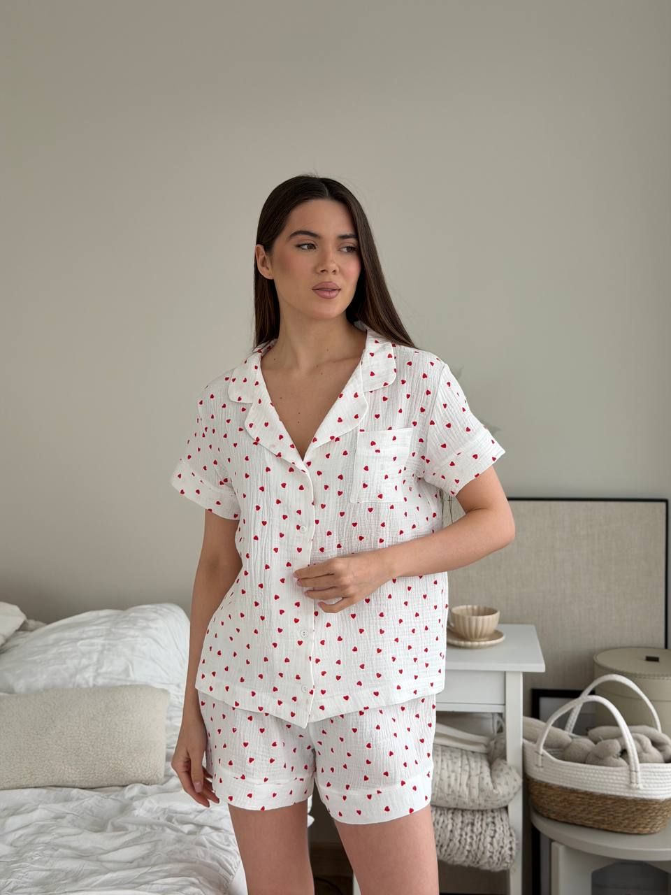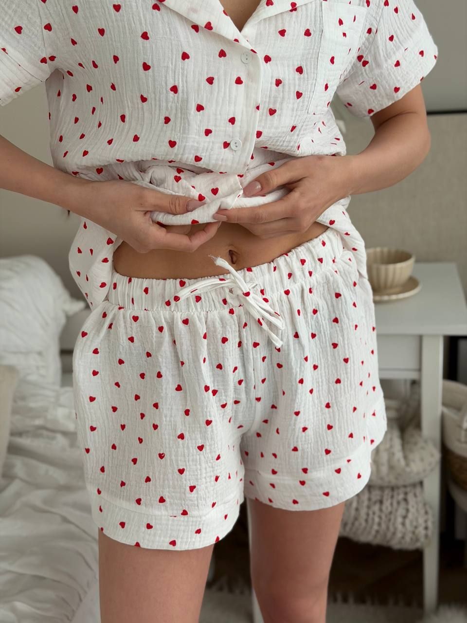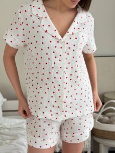 Піжама муслінова жіноча (сорочка з шортами) 102-23-7 червоні сердечка