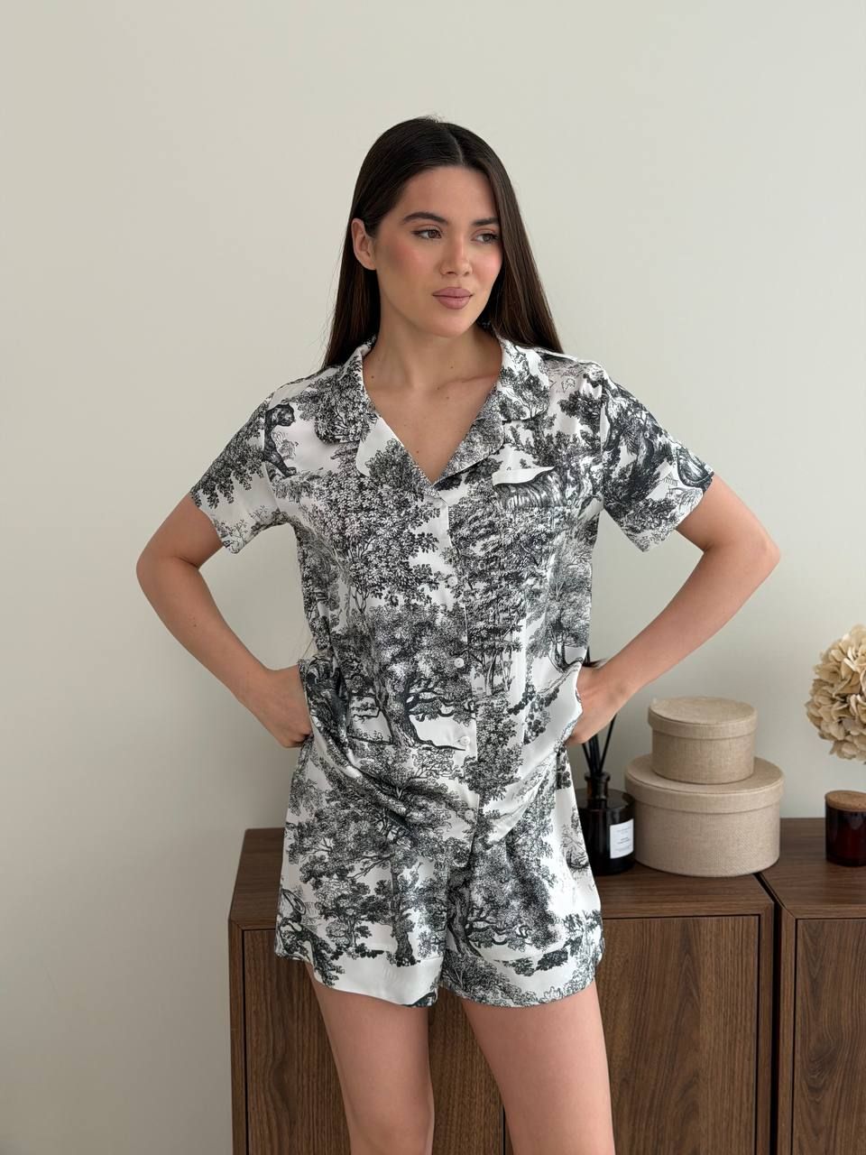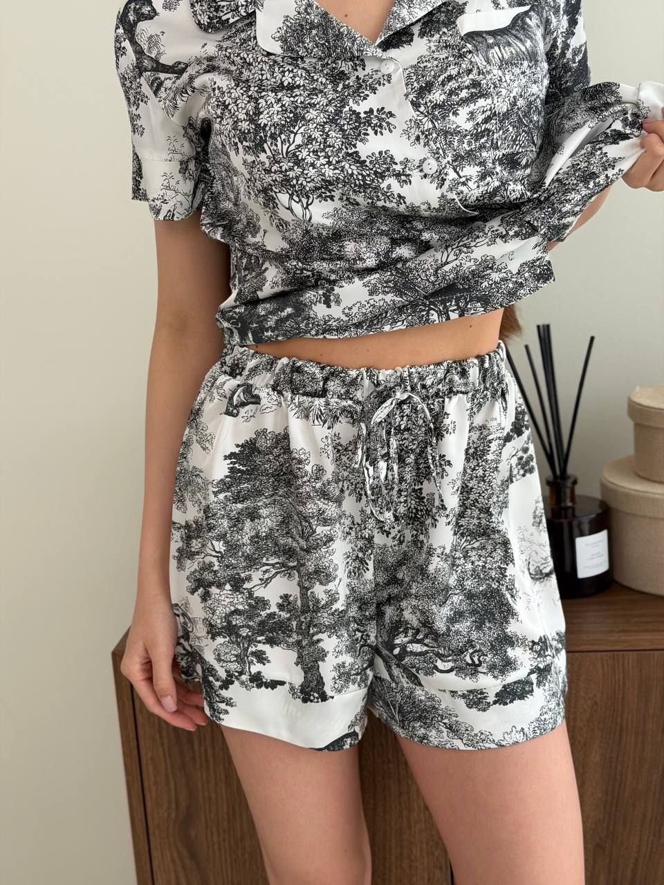 Піжамний комплект- рубашка та шорти з сатина – це стильний та зручний вибір для дому та сну. Рубашка на ґудзиках створює класичний і водночас сучасний образ, дозволяючи регулювати глибину вирізу. Шорти з широкою ноговицею і комфортною посадкою на прошитій резинці доповнені стильними зав'язками, які додають комплексу легкості і налаштовують його під ваші вподобання. Ця піжама підходить як для теплої пори року, так і для міжсезоння завдяки продуманому фасону, що дає шкірі «дихати».