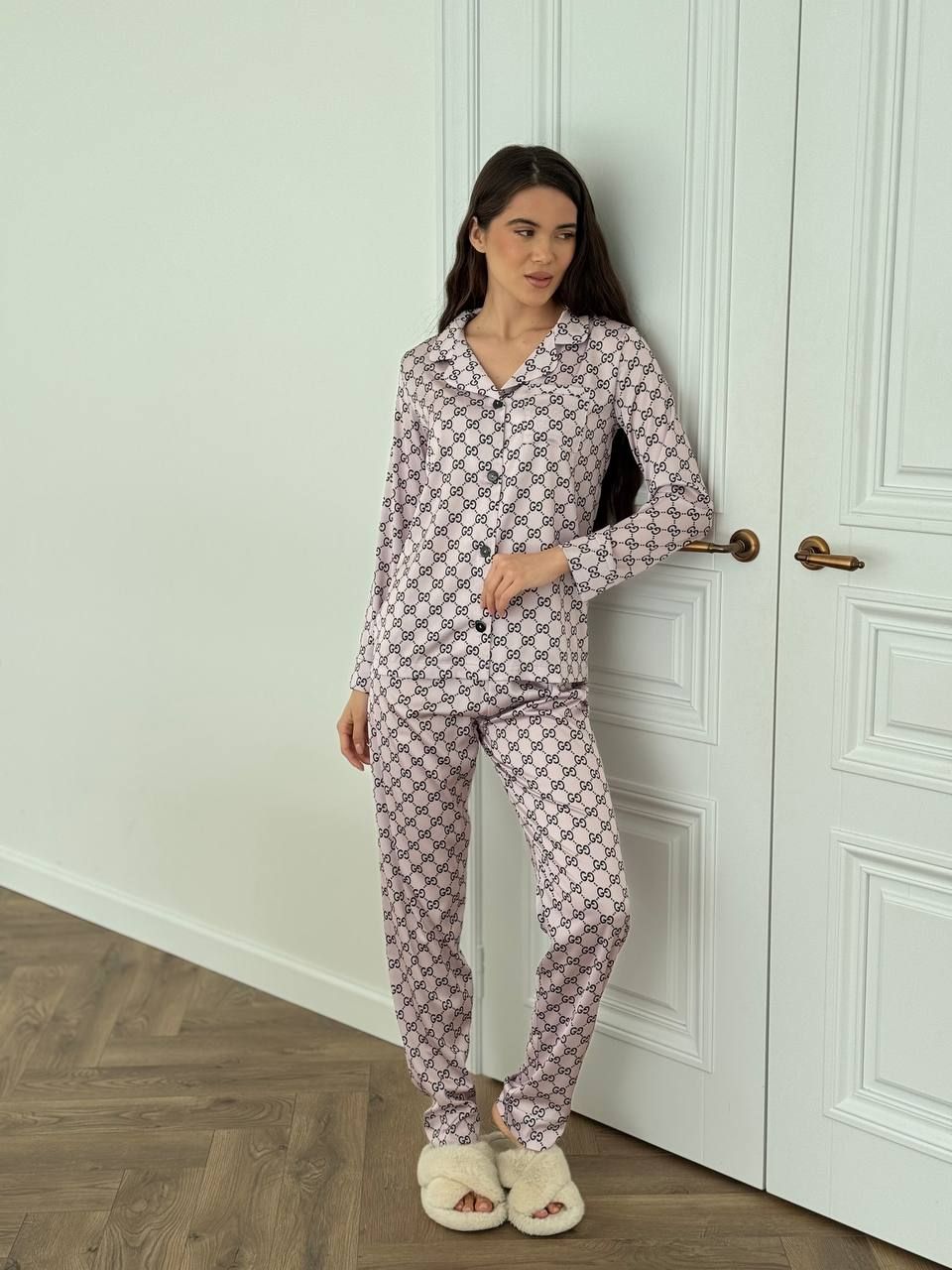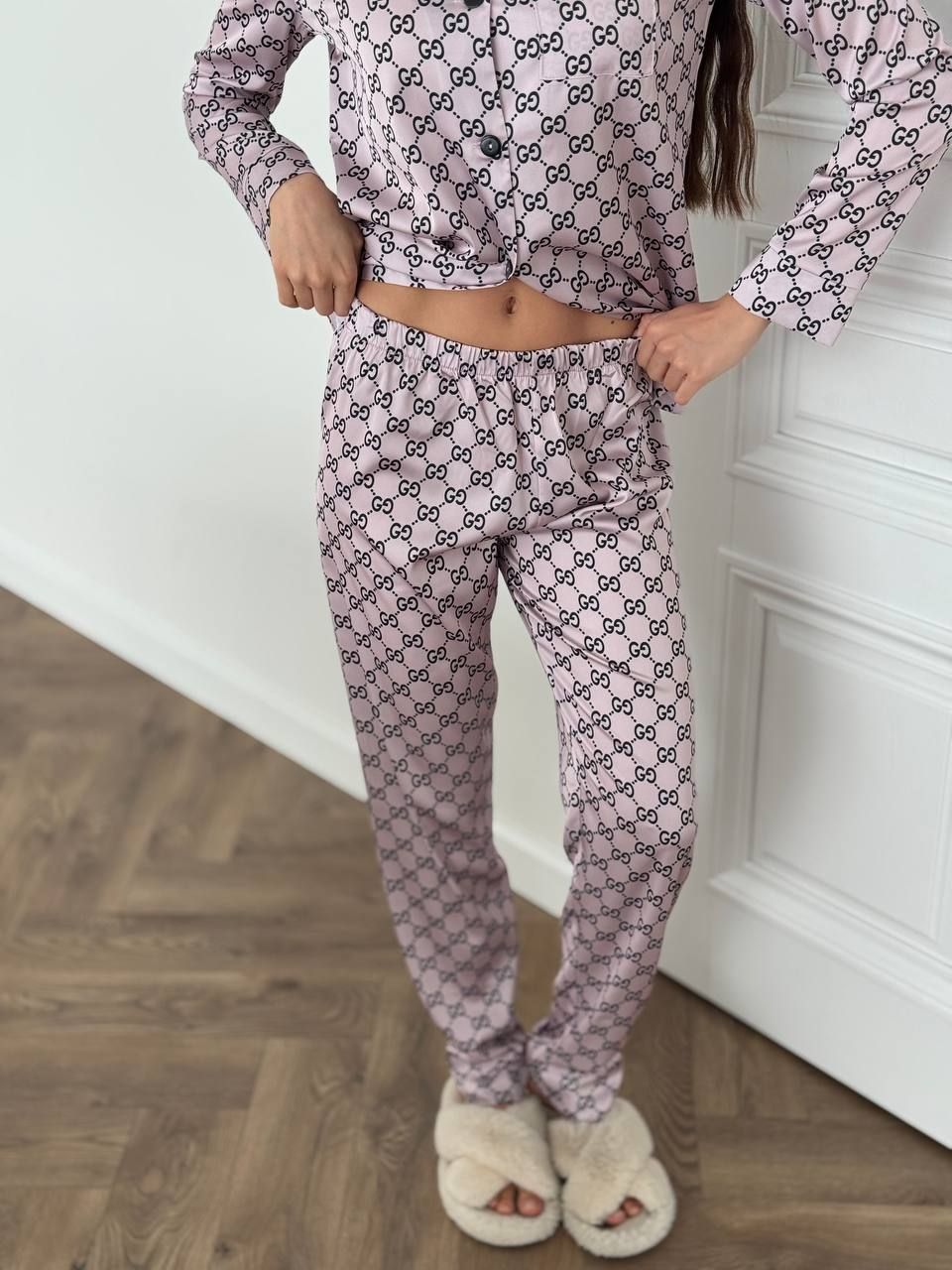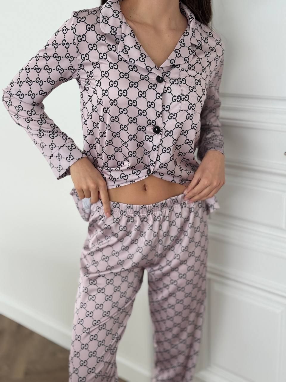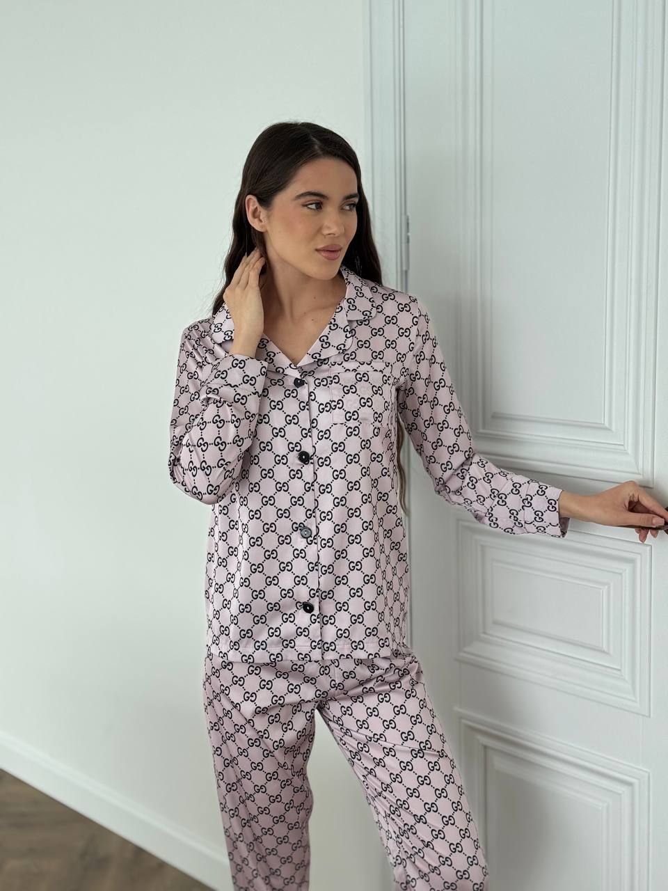 Вишуканий сатиновий домашній комплект. Костюм класно і стильно виглядає, а також дуже зручний для повсякденних хатніх справ та солодкого сну. Гладенька і м’яка на дотик сатинова тканина подарує вам неперевершене відчуття комфорту. Костюм має вільну подовжену сорочку на ґудзиках та накладну кишеню на грудях. Штани прямого крою високої посадки на тонкій резинці на поясі, яка добре тримає, але й не перетискає.