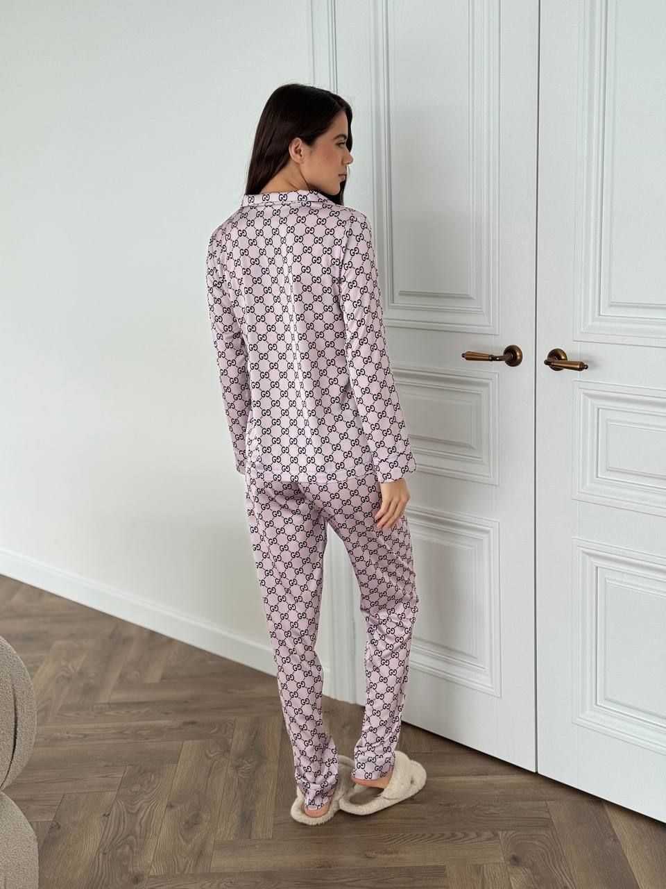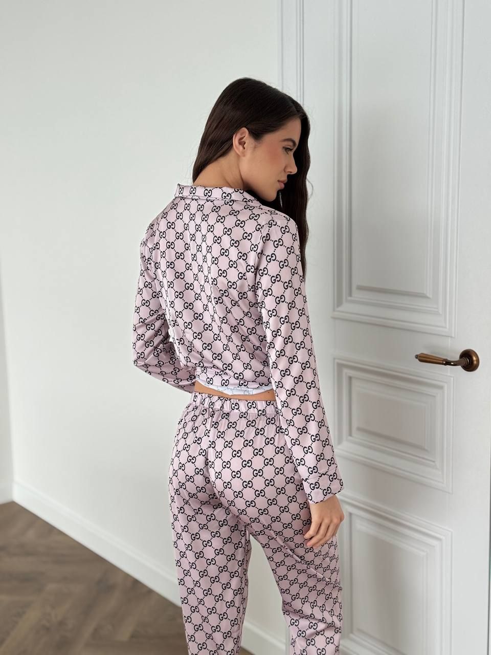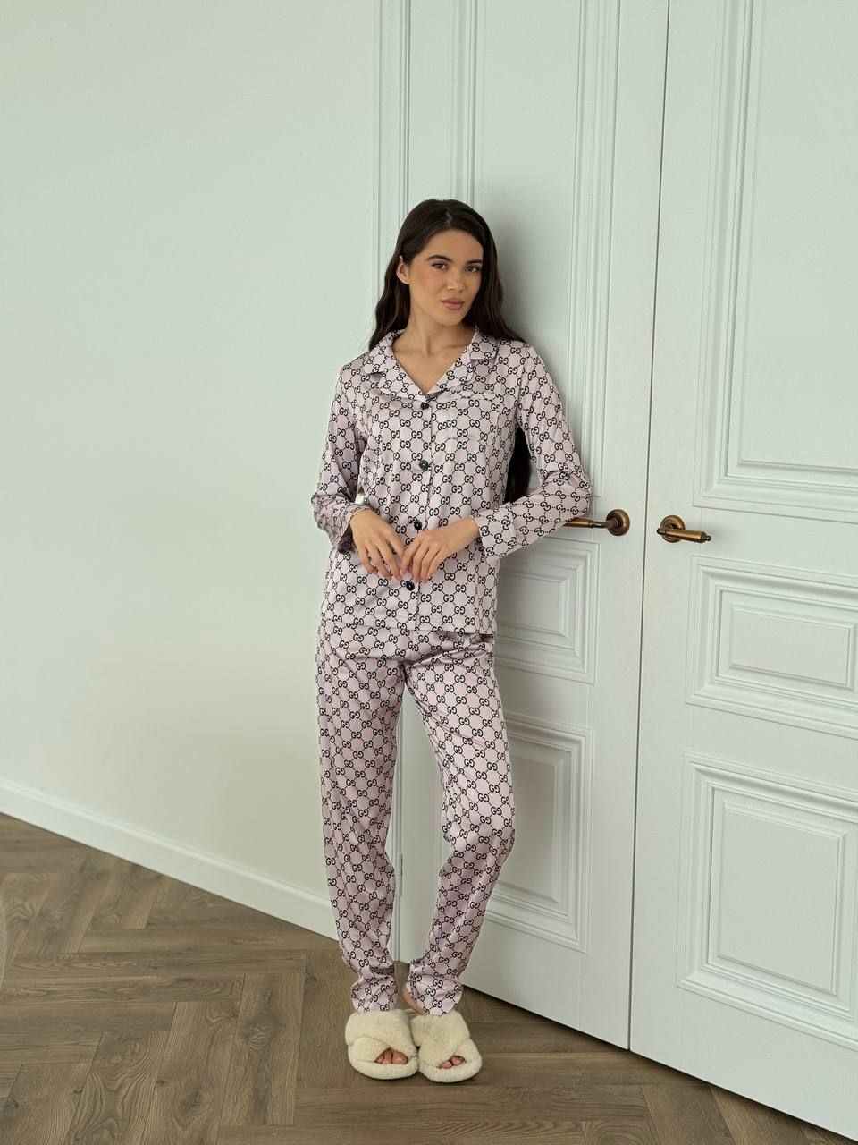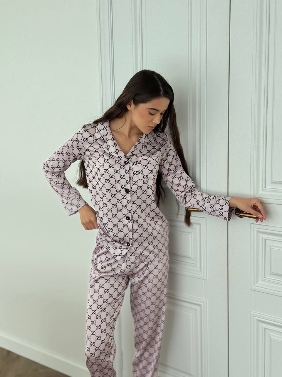 Вишуканий сатиновий домашній комплект. Костюм класно і стильно виглядає, а також дуже зручний для повсякденних хатніх справ та солодкого сну. Гладенька і м’яка на дотик сатинова тканина подарує вам неперевершене відчуття комфорту. Костюм має вільну подовжену сорочку на ґудзиках та накладну кишеню на грудях. Штани прямого крою високої посадки на тонкій резинці на поясі, яка добре тримає, але й не перетискає.