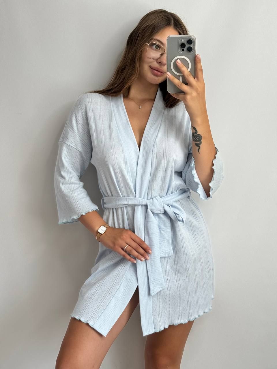 Ніжний домашній жіночий халат з бамбукового трикотажу — ідеальний вибір для щоденного комфорту. Легка дихаюча тканина приємна до тіла, добре пропускає повітря та дарує відчуття свіжості. Класичний крій на запах з поясом м’яко підкреслює талію та забезпечує зручну посадку. Чудово підходить для відпочинку вдома, ранкових ритуалів або затишних вечорів.