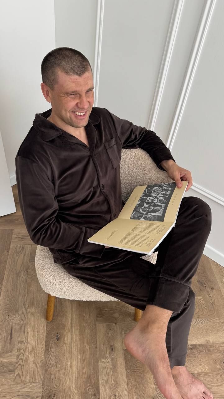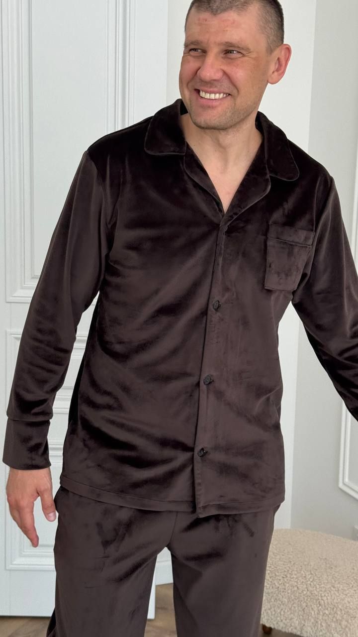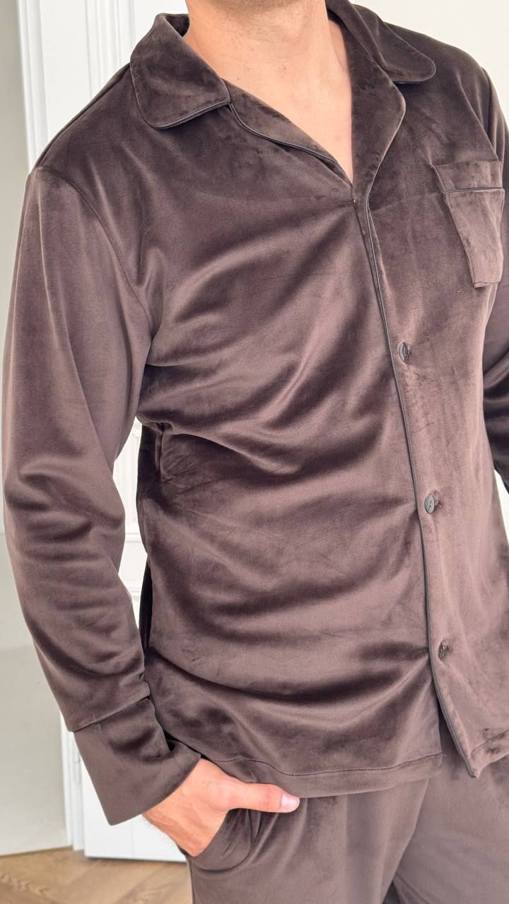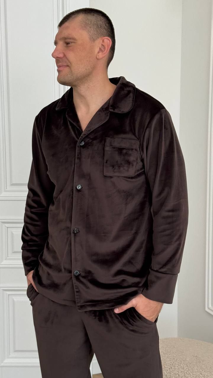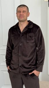 Стильний чоловічий домашній костюм із м’якого велюру на ґудзиках. Комфортний, приємний до тіла комплект, що чудово підходить для високих чоловіків. Ідеальний вибір для затишного відпочинку вдома.