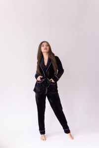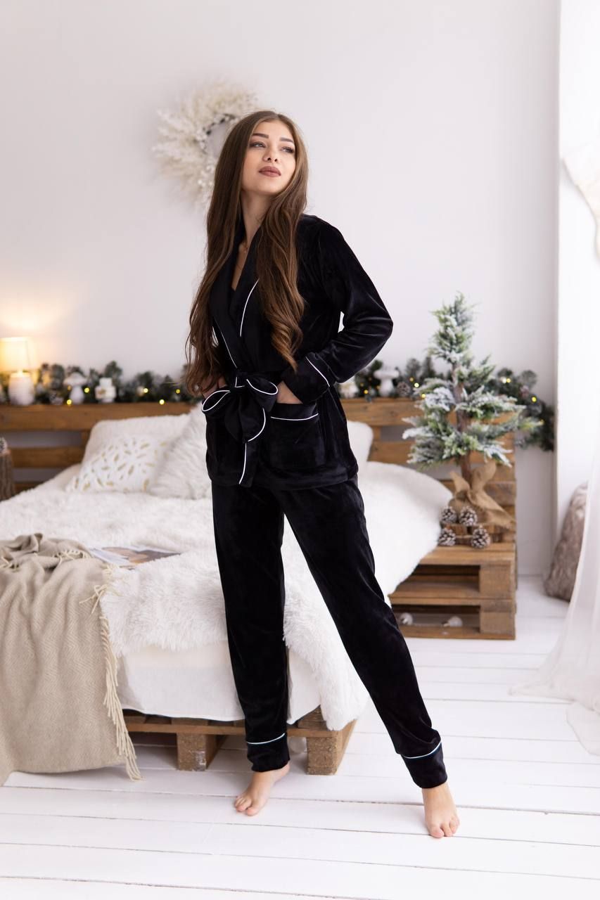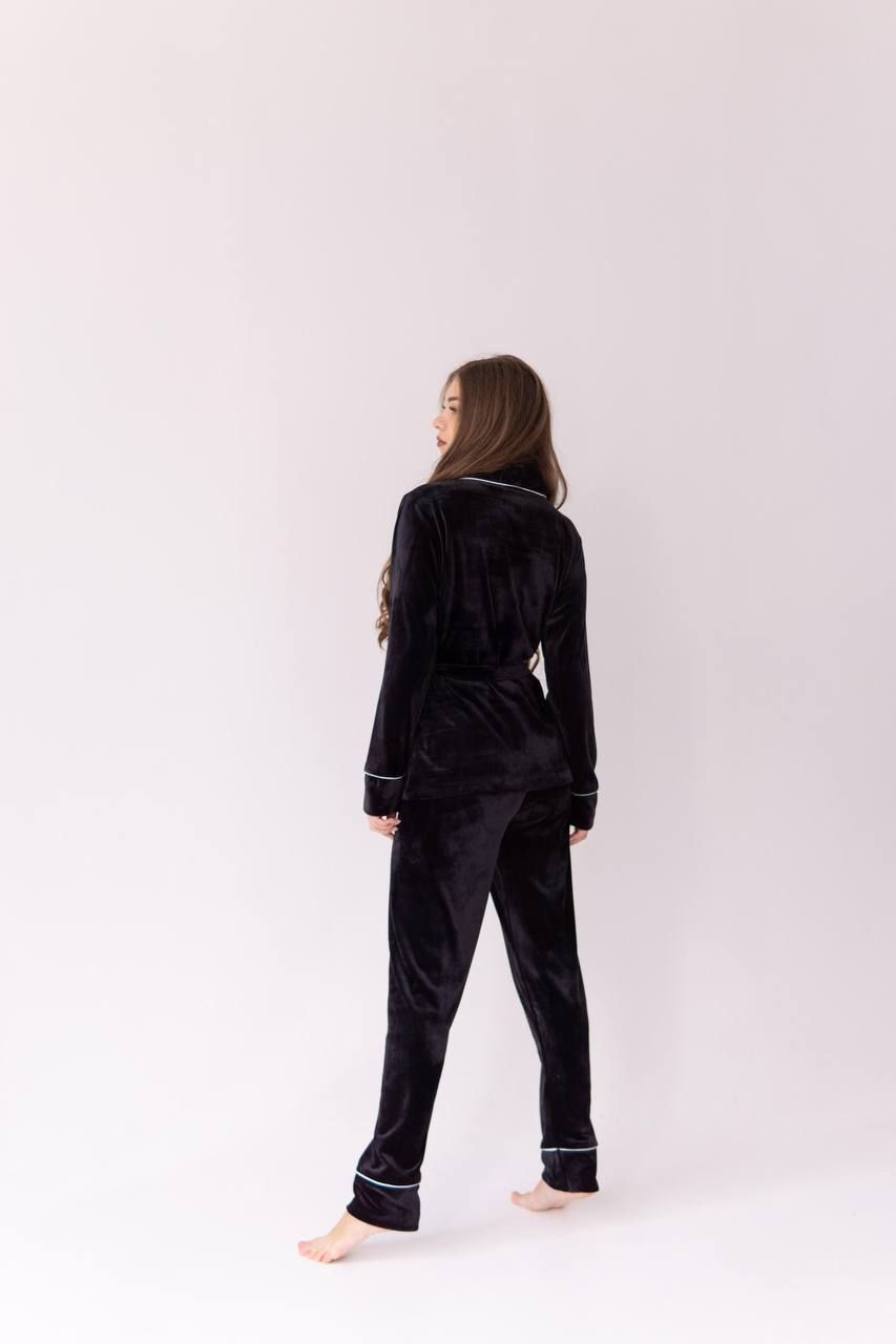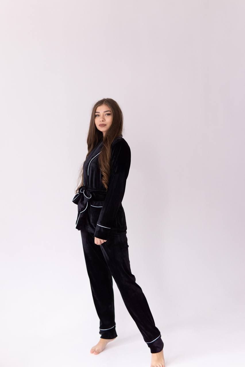 Жіночий домашній костюм велюровий (штани і кофта під пояс) 065-21 чорний