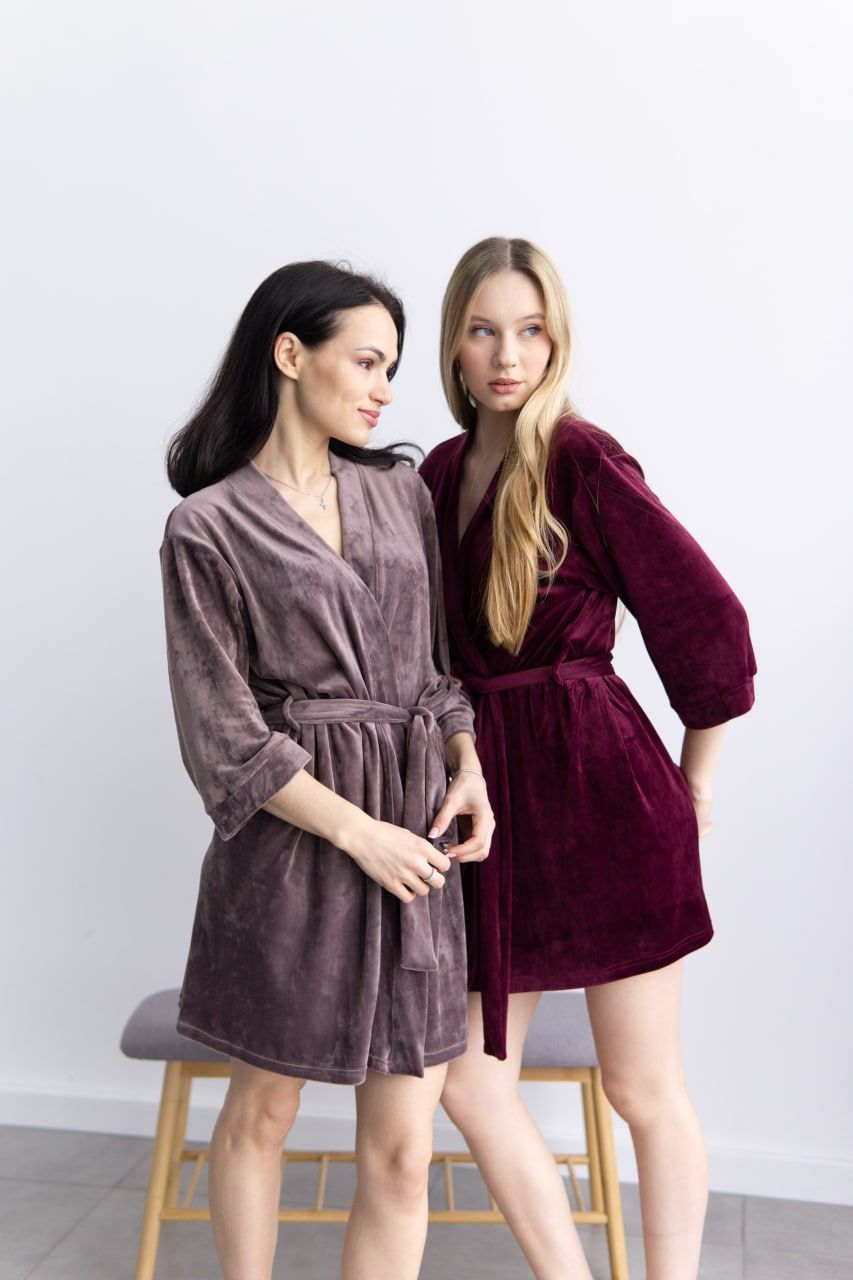 Довгі велюрові халати з поясом. Розкішні халати з м’якого велюру створені для вашого комфорту та бездоганного вигляду. Модель має внутрішні зав’язки для надійної фіксації та елегантний пояс, який підкреслює талію. Широкі рукави ¾ додають шарму та вишуканості образу. Ідеальний вибір для домашнього затишку з ноткою розкоші.