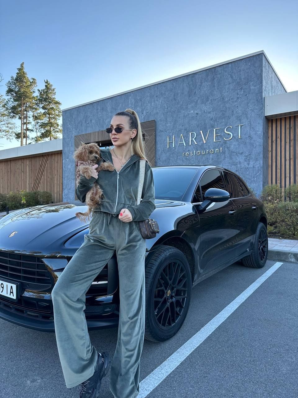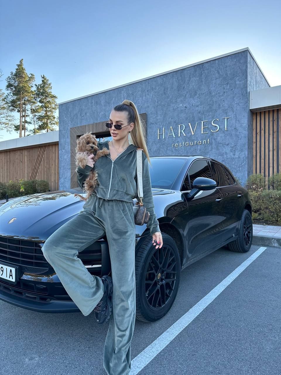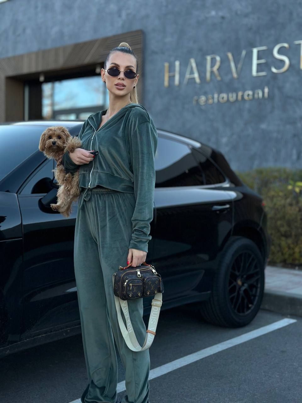 Трендовий велюровий костюм-двійка. Комплект складається з укороченої кофти на замочку з подвійним капюшоном та прямих штанах вільного крою.