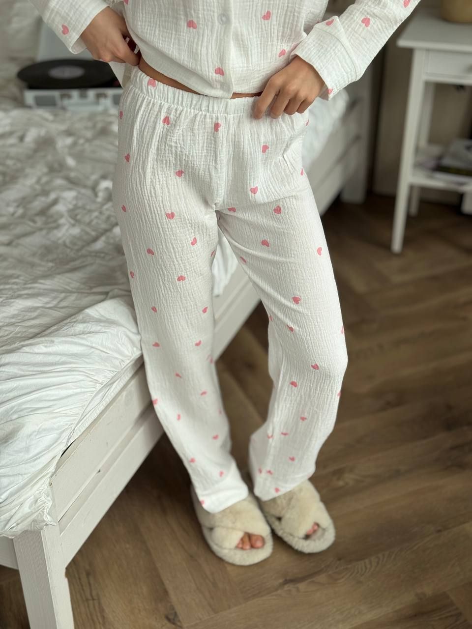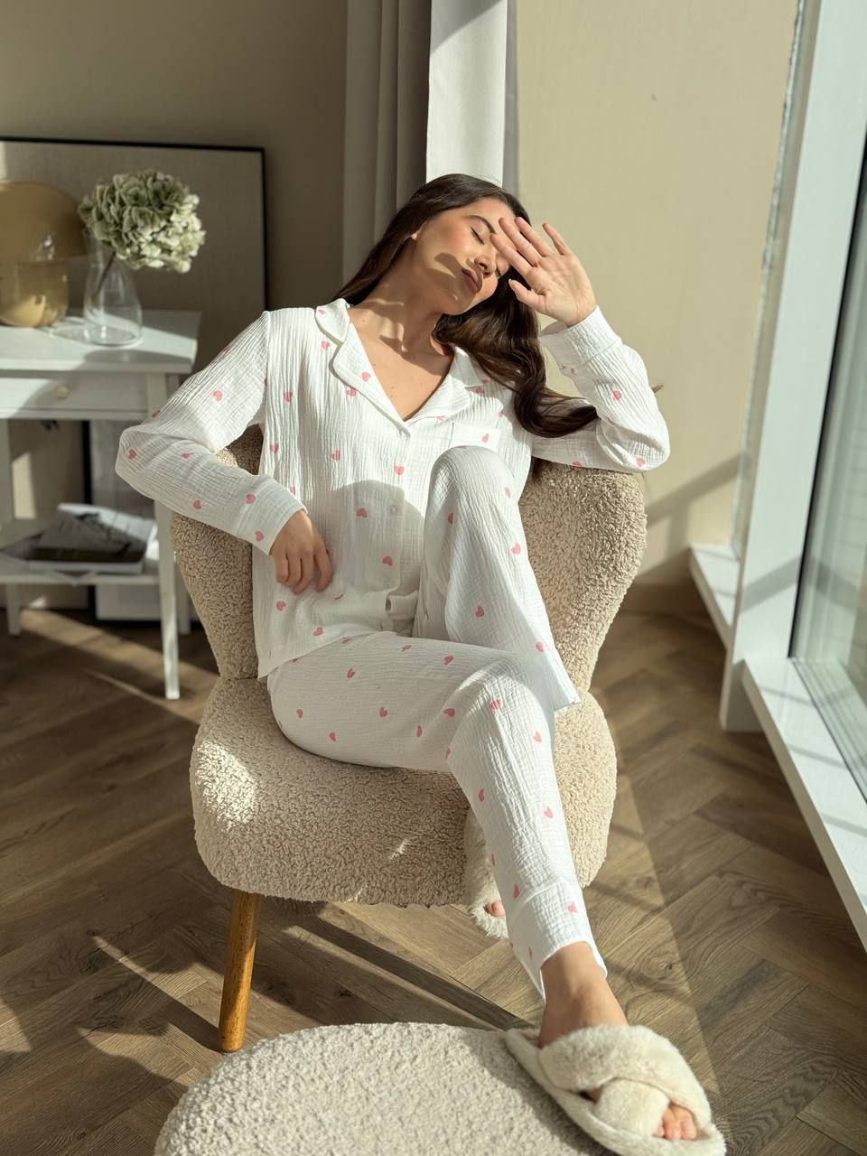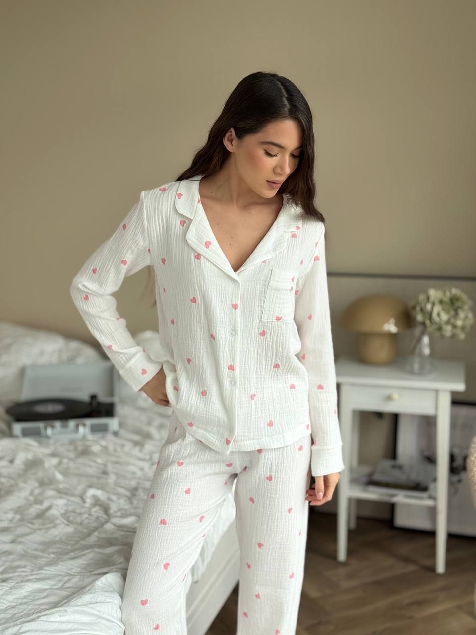 Стильний костюм із високоякісного мусліну в трендовому оверсайз крої, що дарує комфорт і свободу рухів. Підійде для дівчат з будь-якою фігурою. Ніжна, дихаюча тканина приємна до тіла та забезпечує максимальний комфорт у будь-яку пору року. Сорочка на ґудзиках із накладною кишенькою. Прямі штани середньої посадки з прошитою одинарною резинкою. Ідеальний вибір для домашнього затишку, прогулянок чи подорожей.