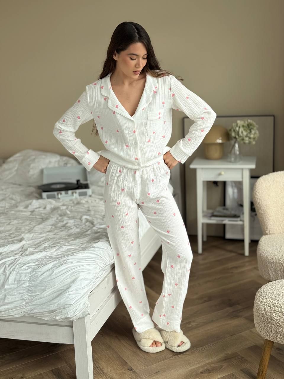 Жіночий піжамний комплект з мусліну 143-231 в рожеве сердечко