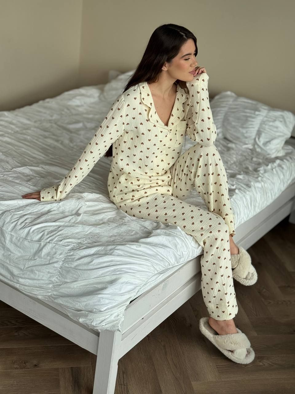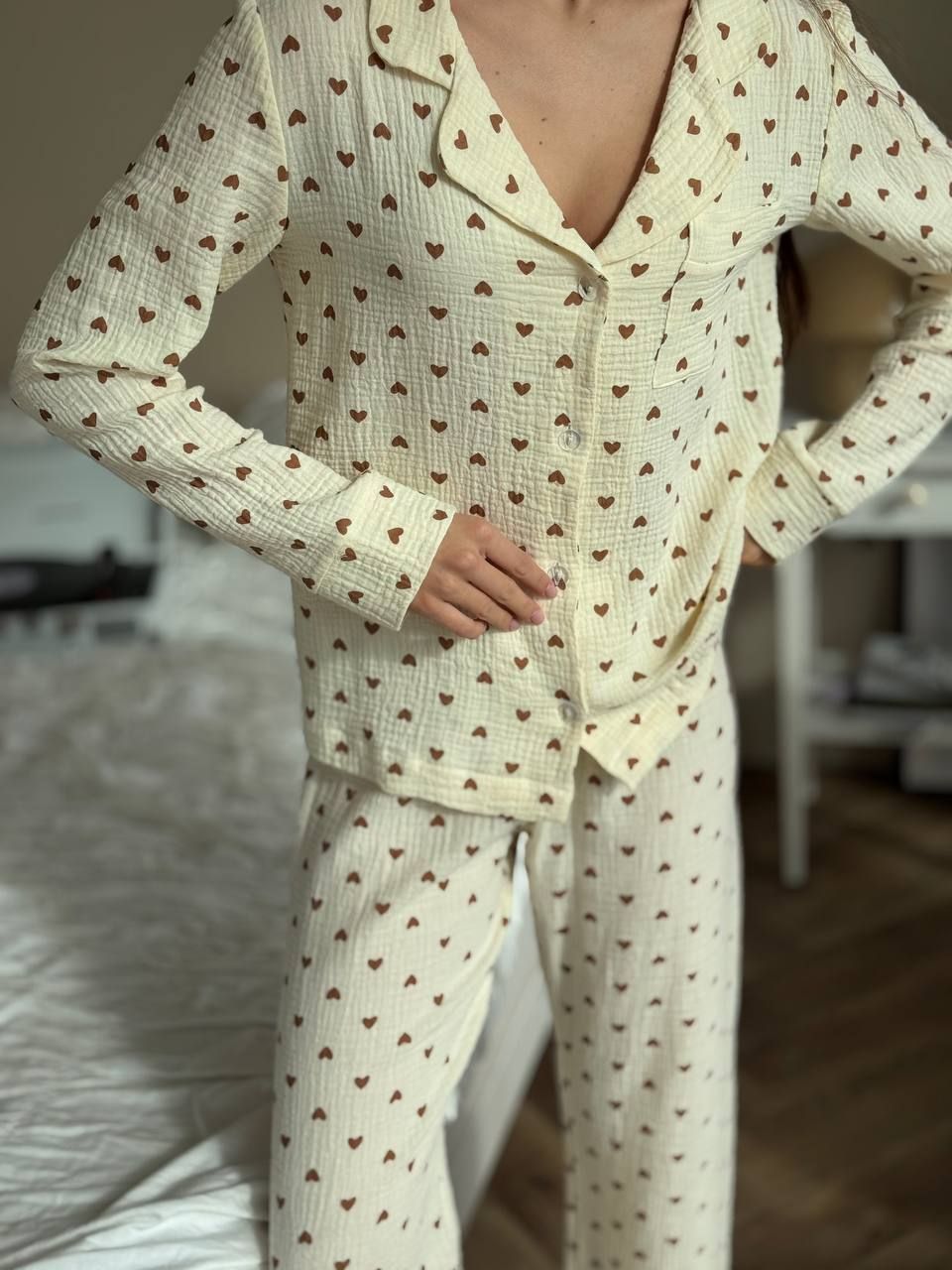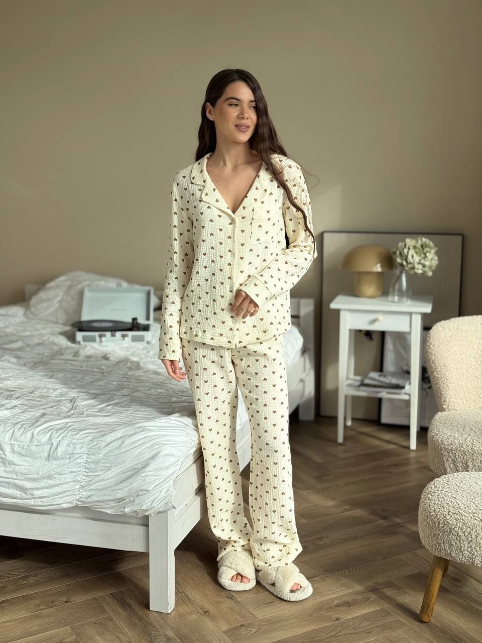 Стильний костюм із високоякісного мусліну в трендовому оверсайз крої, що дарує комфорт і свободу рухів. Підійде для дівчат з будь-якою фігурою. Ніжна, дихаюча тканина приємна до тіла та забезпечує максимальний комфорт у будь-яку пору року. Сорочка на ґудзиках із накладною кишенькою. Прямі штани середньої посадки з прошитою одинарною резинкою. Ідеальний вибір для домашнього затишку, прогулянок чи подорожей.