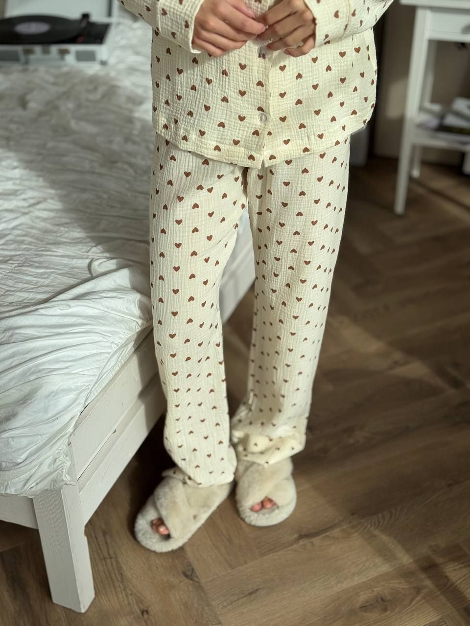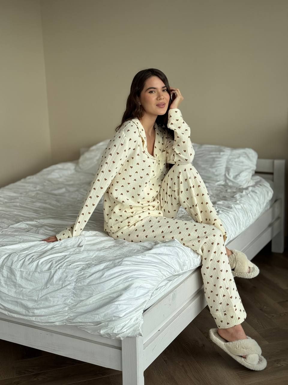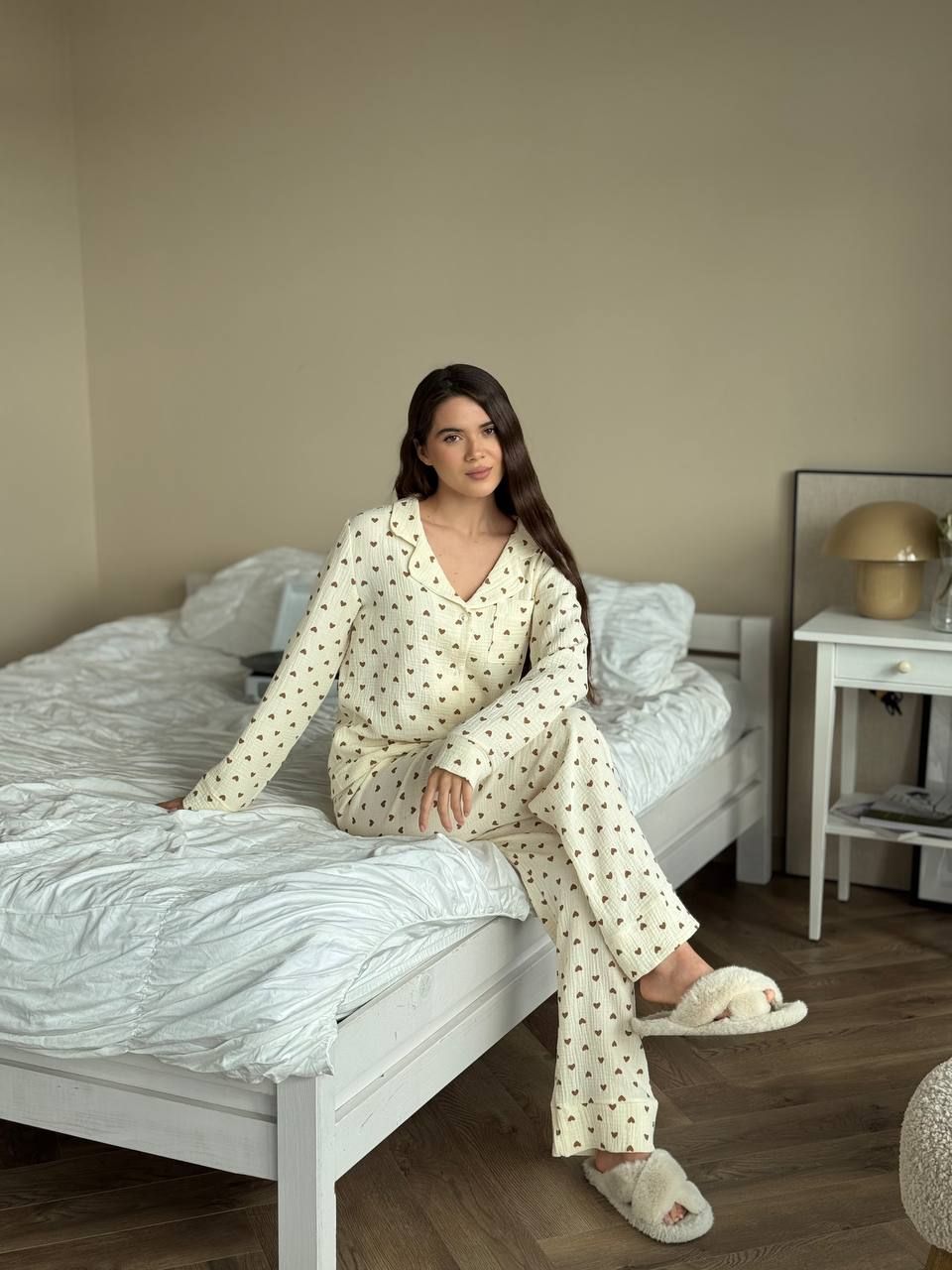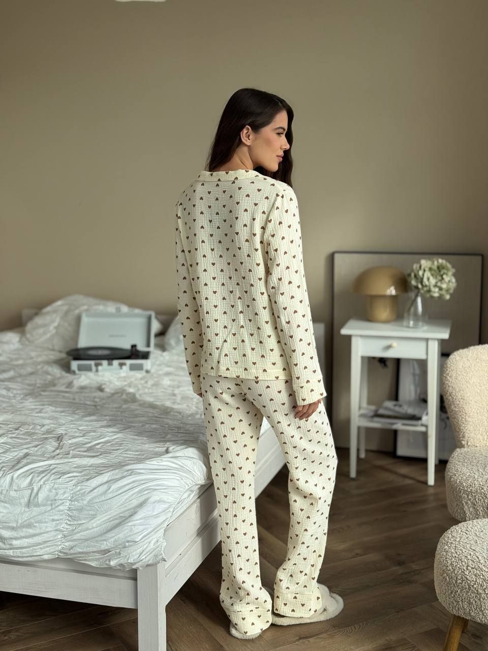 Стильний костюм із високоякісного мусліну в трендовому оверсайз крої, що дарує комфорт і свободу рухів. Підійде для дівчат з будь-якою фігурою. Ніжна, дихаюча тканина приємна до тіла та забезпечує максимальний комфорт у будь-яку пору року. Сорочка на ґудзиках із накладною кишенькою. Прямі штани середньої посадки з прошитою одинарною резинкою. Ідеальний вибір для домашнього затишку, прогулянок чи подорожей.