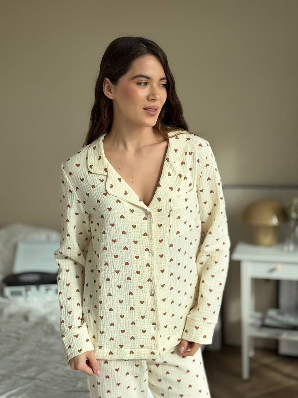 Жіночий піжамний комплект з мусліну 143-231 жовтий в сердечко
