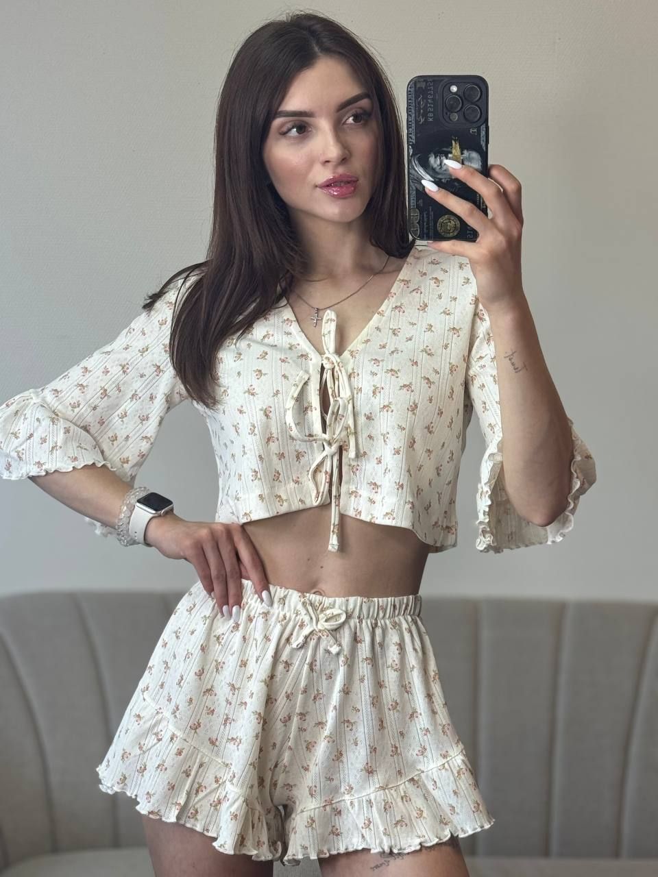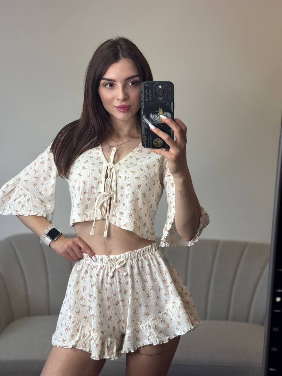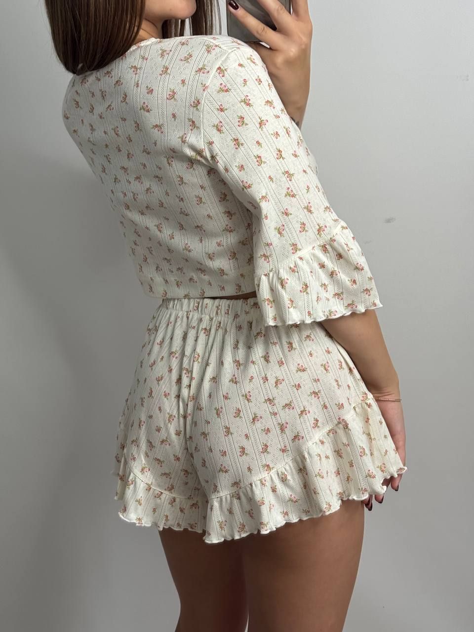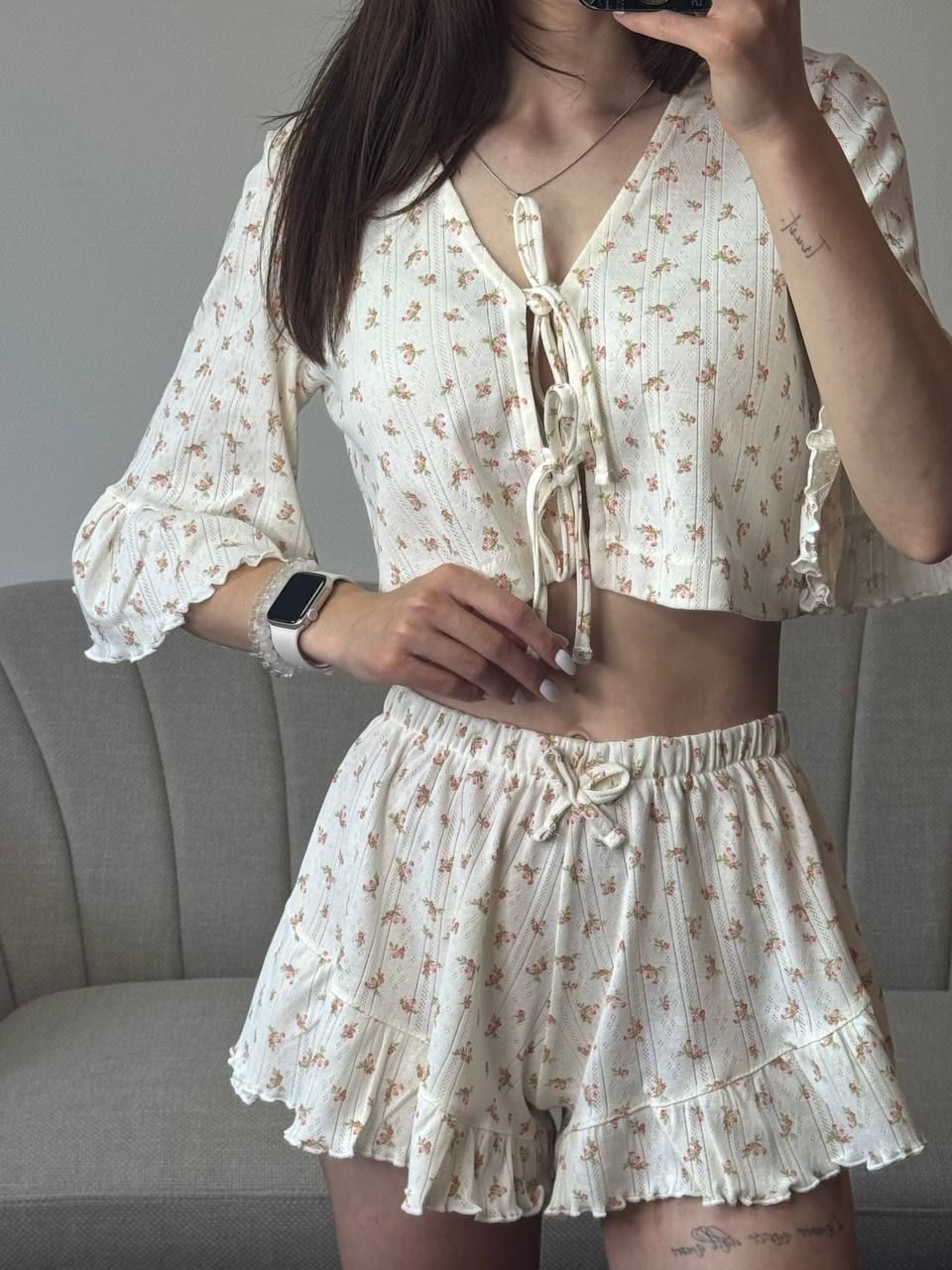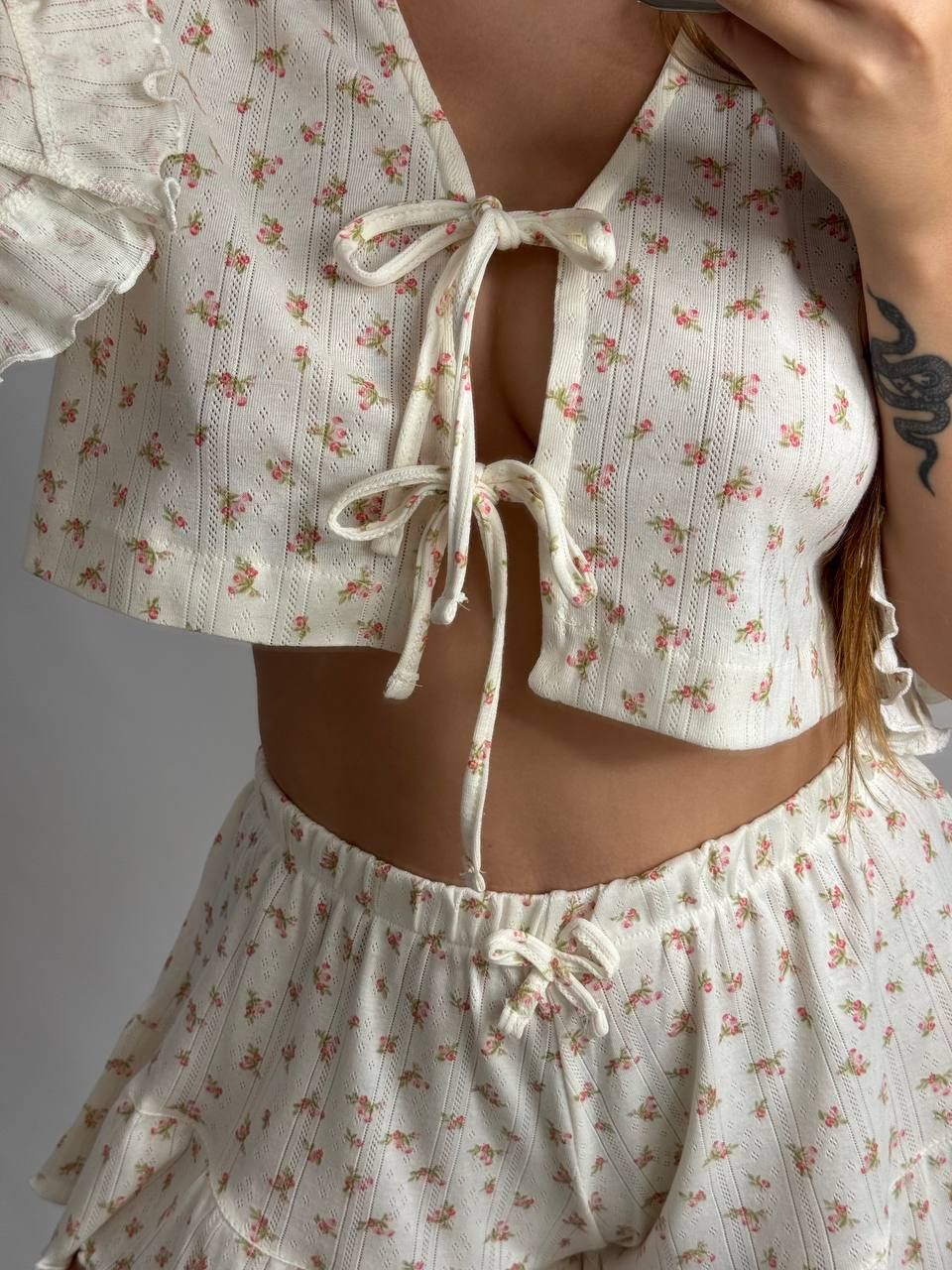 Зваблива трикотажна піжама на зав’язках — стильний та комфортний комплект для домашнього відпочинку. Укорочена вільна кофтинка з оригінальним передом на зав’язках підкреслює жіночність, а рукави з рюшами додають образу легкості та романтичності. Шортики з високою посадкою мають вільний крій і оздоблені рюшами, що забезпечує максимальний комфорт і привабливий вигляд. Ідеальний вибір для затишних вечорів та красивих домашніх образів.