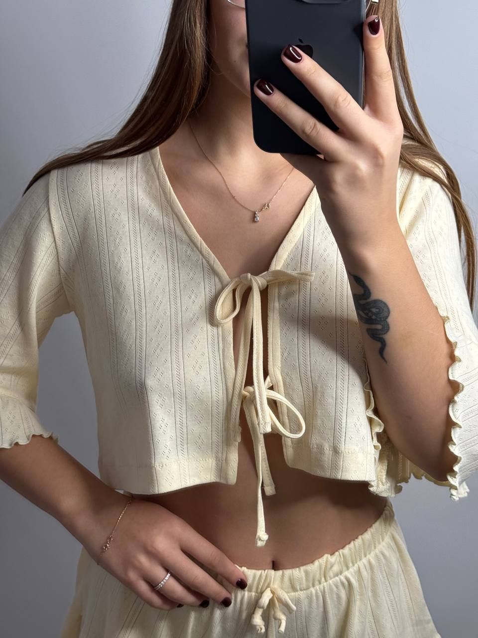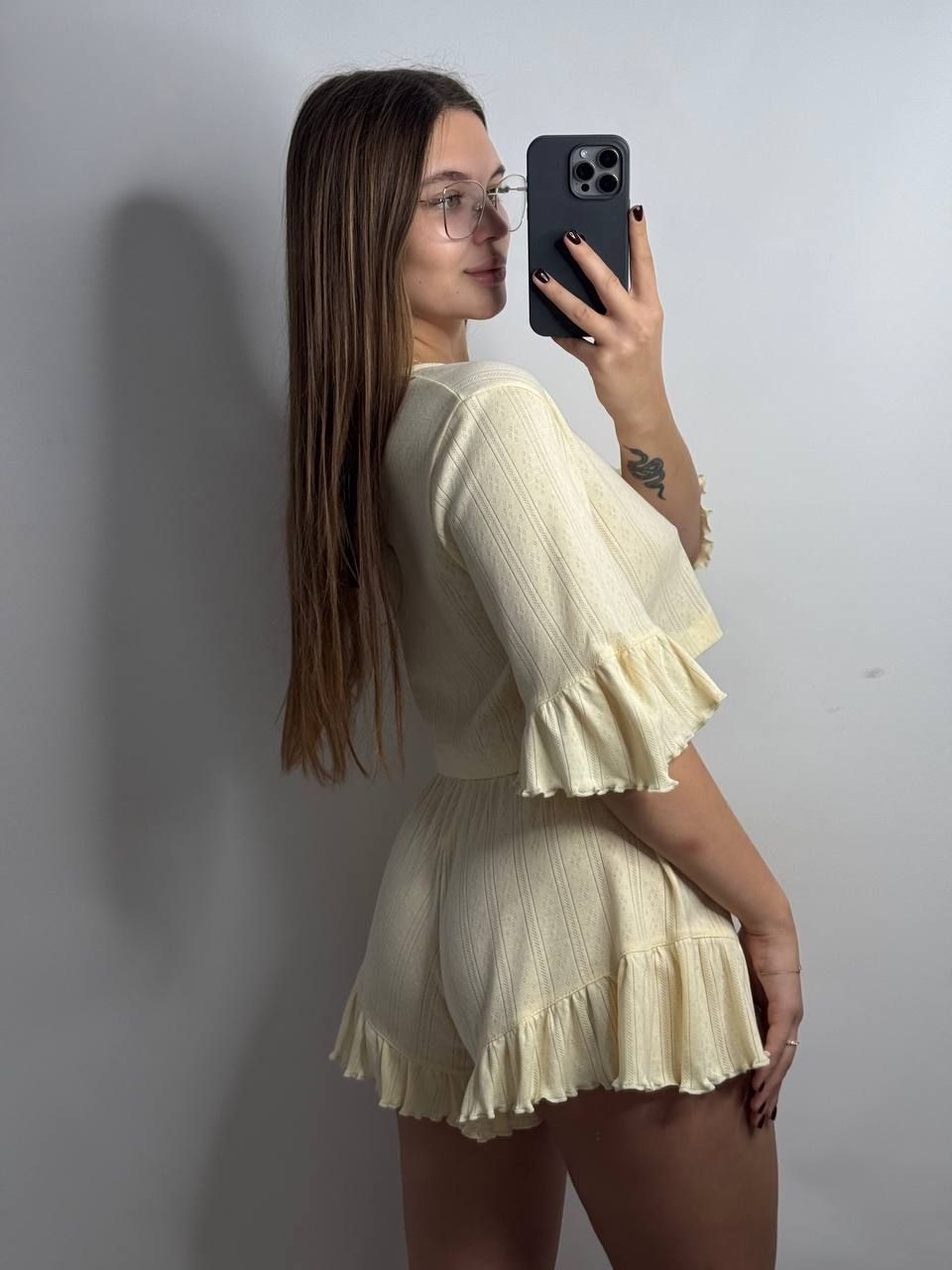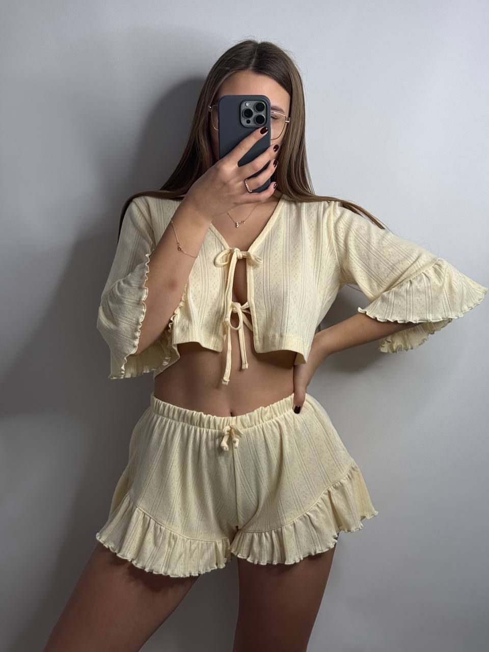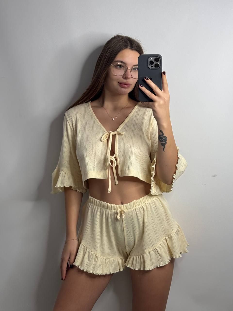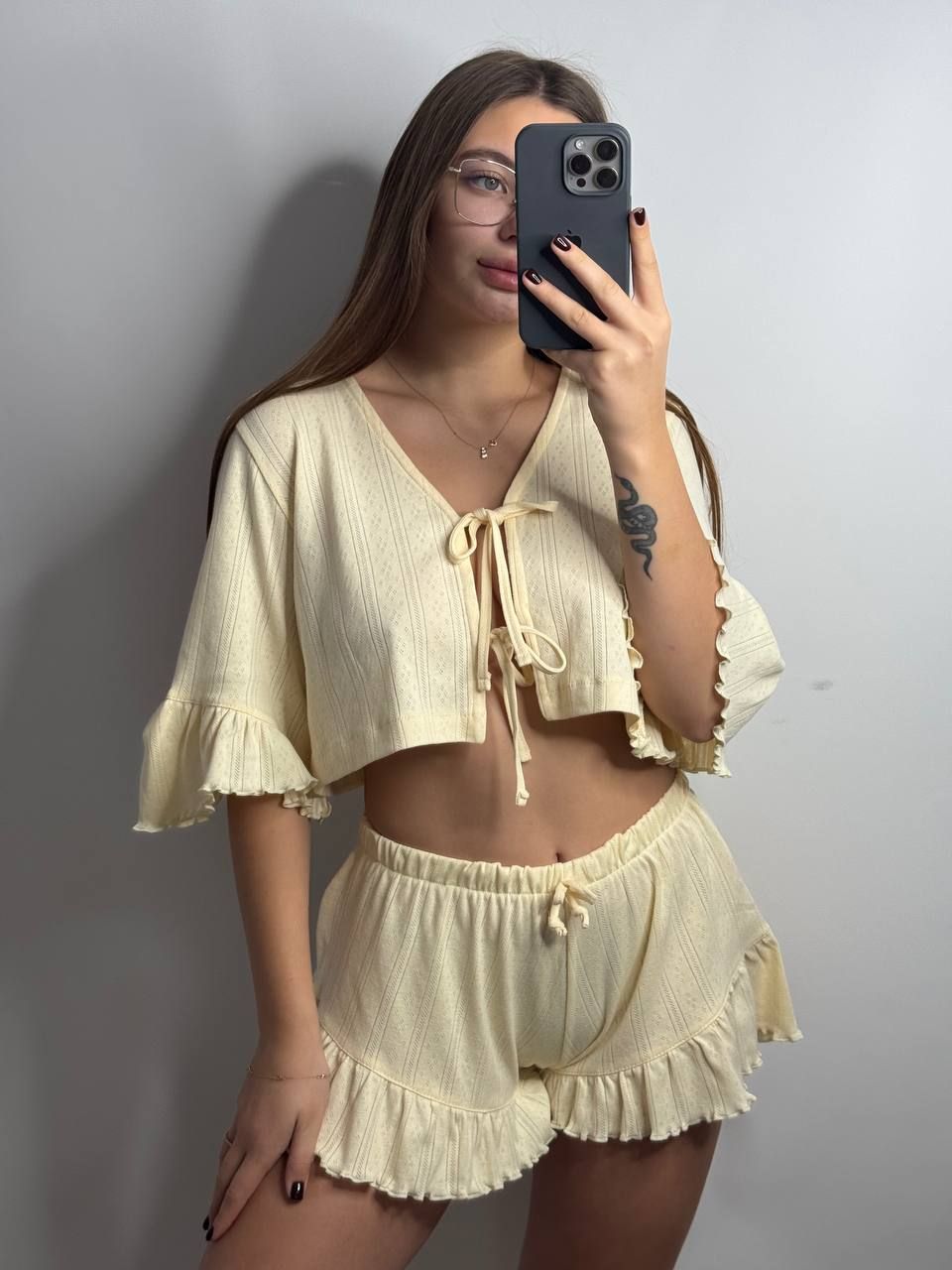 Зваблива трикотажна піжама на зав’язках — стильний та комфортний комплект для домашнього відпочинку. Укорочена вільна кофтинка з оригінальним передом на зав’язках підкреслює жіночність, а рукави з рюшами додають образу легкості та романтичності. Шортики з високою посадкою мають вільний крій і оздоблені рюшами, що забезпечує максимальний комфорт і привабливий вигляд. Ідеальний вибір для затишних вечорів та красивих домашніх образів.