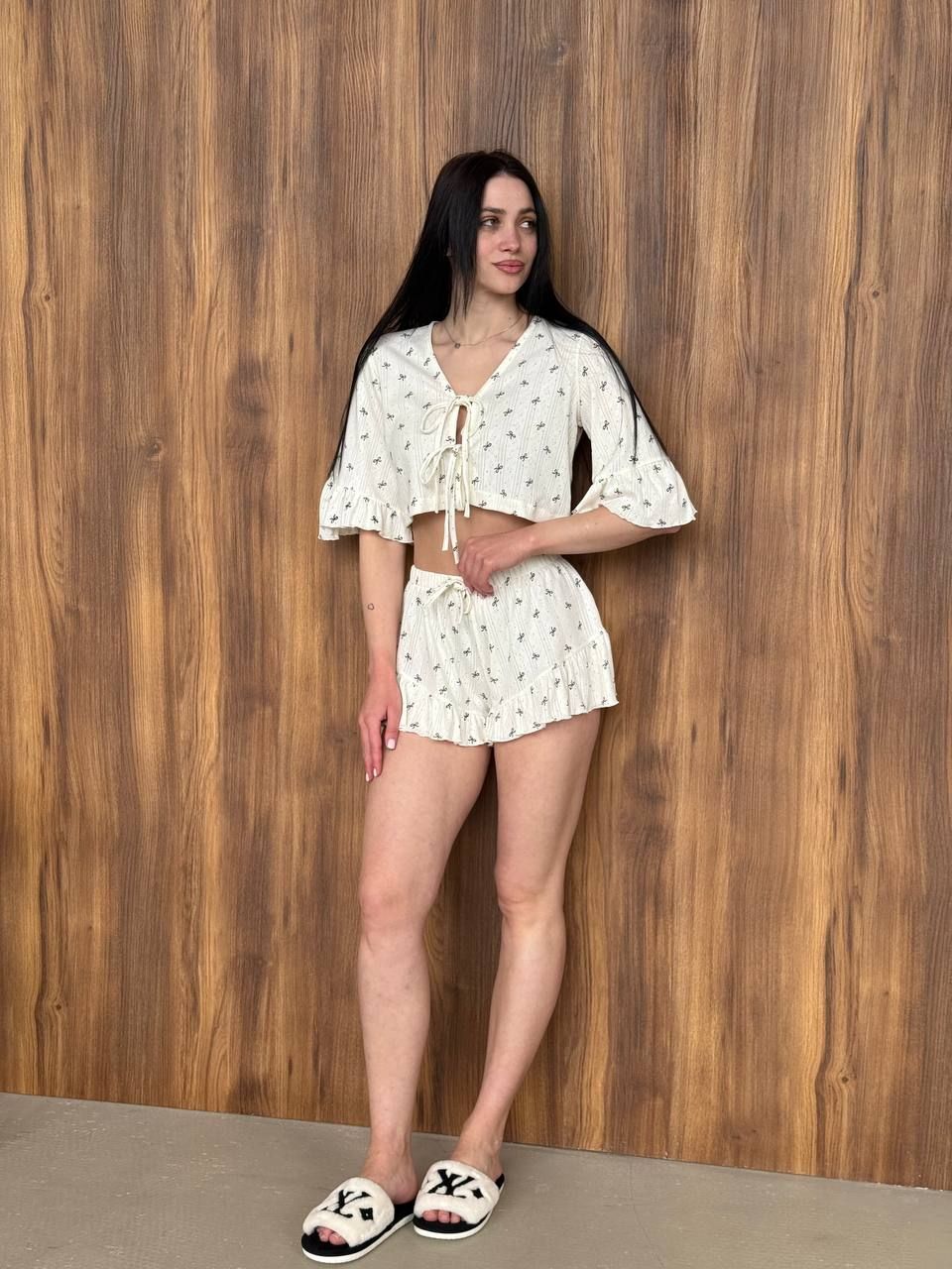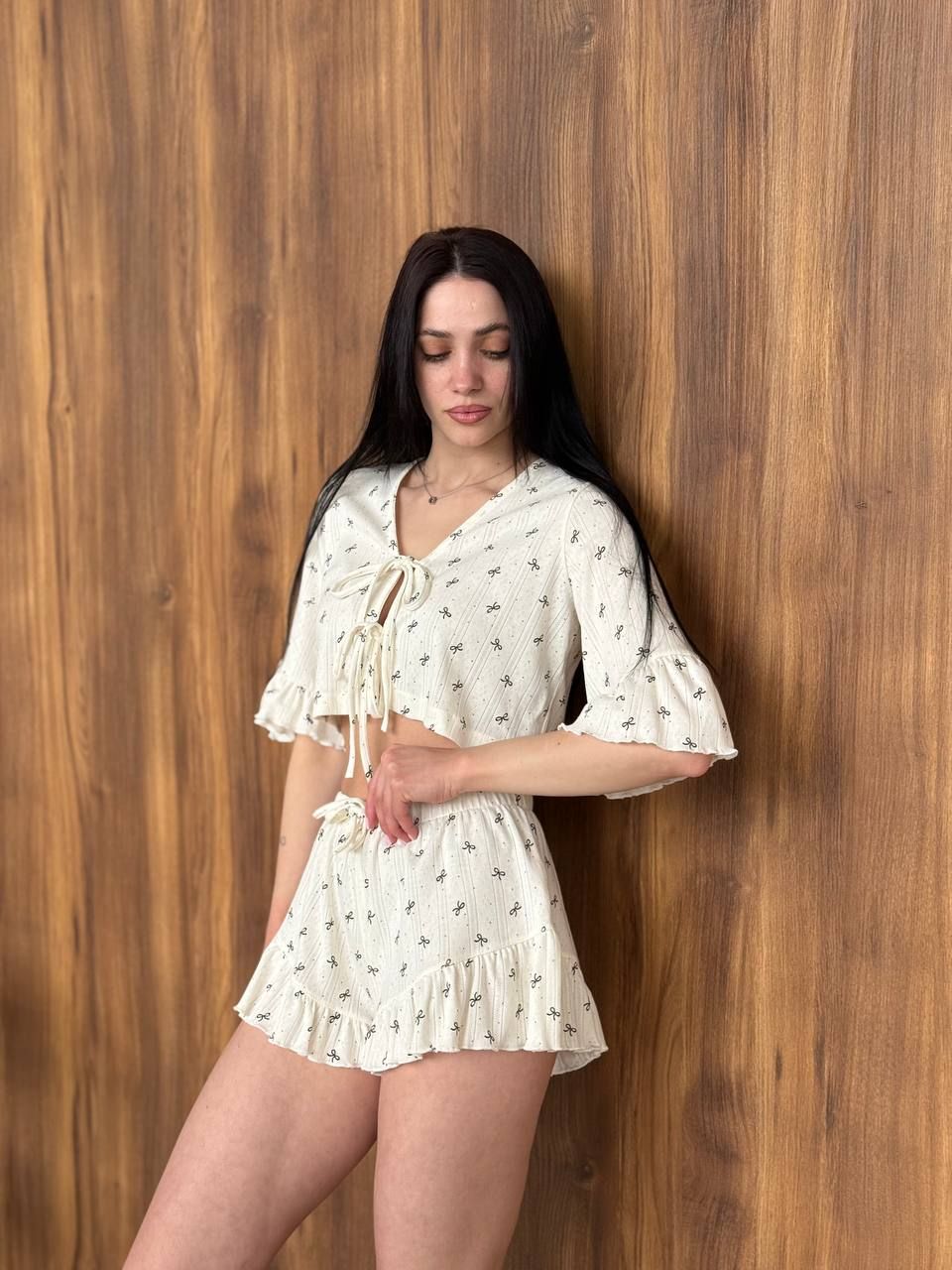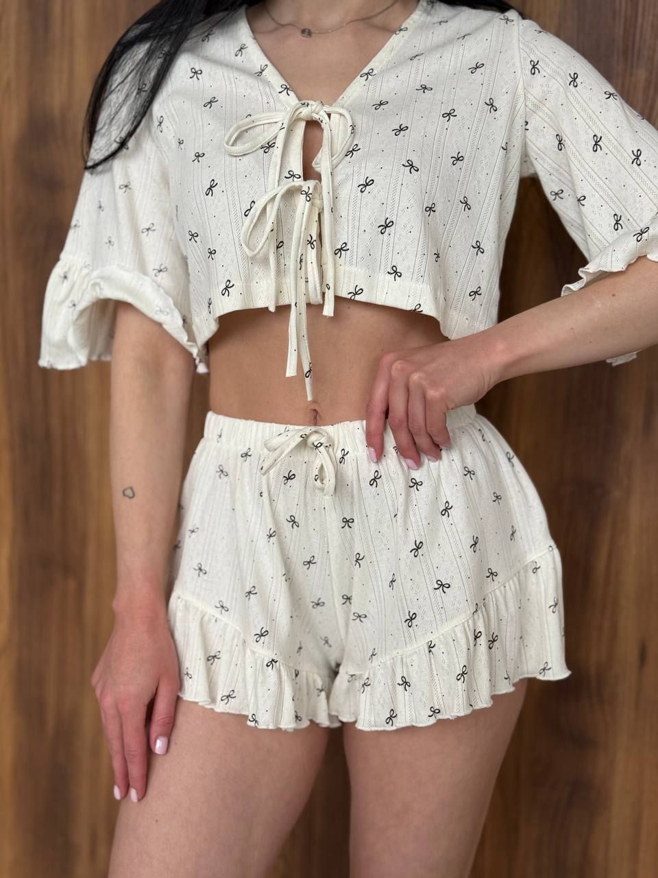 Зваблива трикотажна піжама на зав’язках — стильний та комфортний комплект для домашнього відпочинку. Укорочена вільна кофтинка з оригінальним передом на зав’язках підкреслює жіночність, а рукави з рюшами додають образу легкості та романтичності. Шортики з високою посадкою мають вільний крій і оздоблені рюшами, що забезпечує максимальний комфорт і привабливий вигляд. Ідеальний вибір для затишних вечорів та красивих домашніх образів.