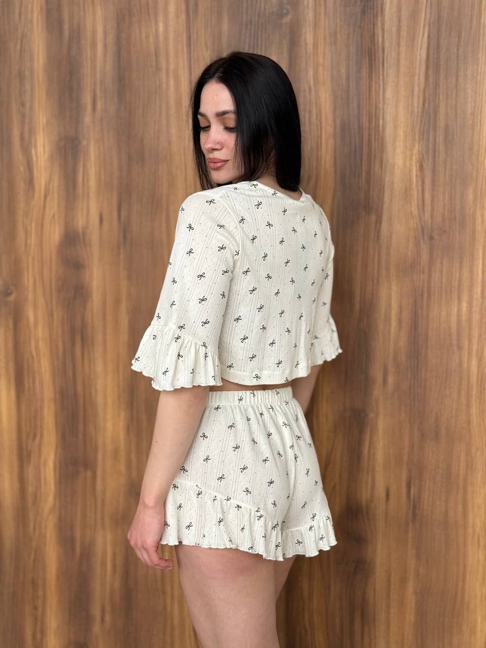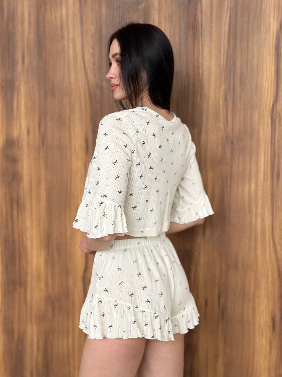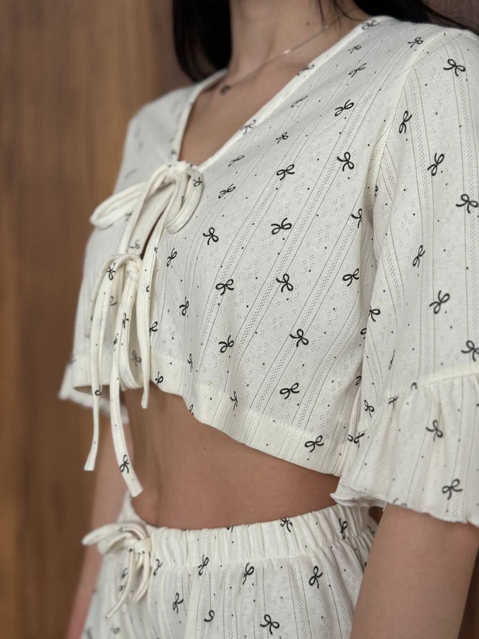 Зваблива трикотажна піжама на зав’язках — стильний та комфортний комплект для домашнього відпочинку. Укорочена вільна кофтинка з оригінальним передом на зав’язках підкреслює жіночність, а рукави з рюшами додають образу легкості та романтичності. Шортики з високою посадкою мають вільний крій і оздоблені рюшами, що забезпечує максимальний комфорт і привабливий вигляд. Ідеальний вибір для затишних вечорів та красивих домашніх образів.