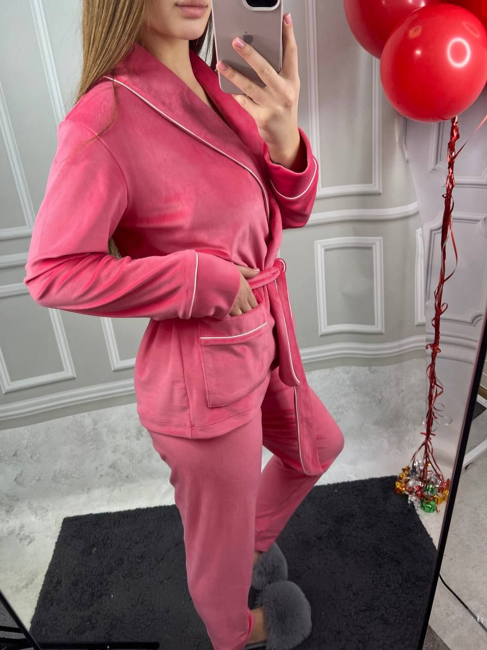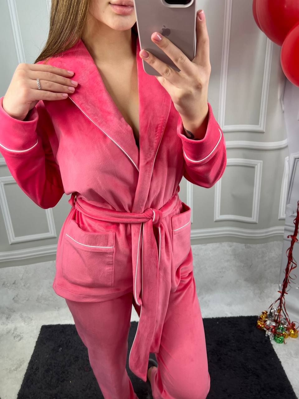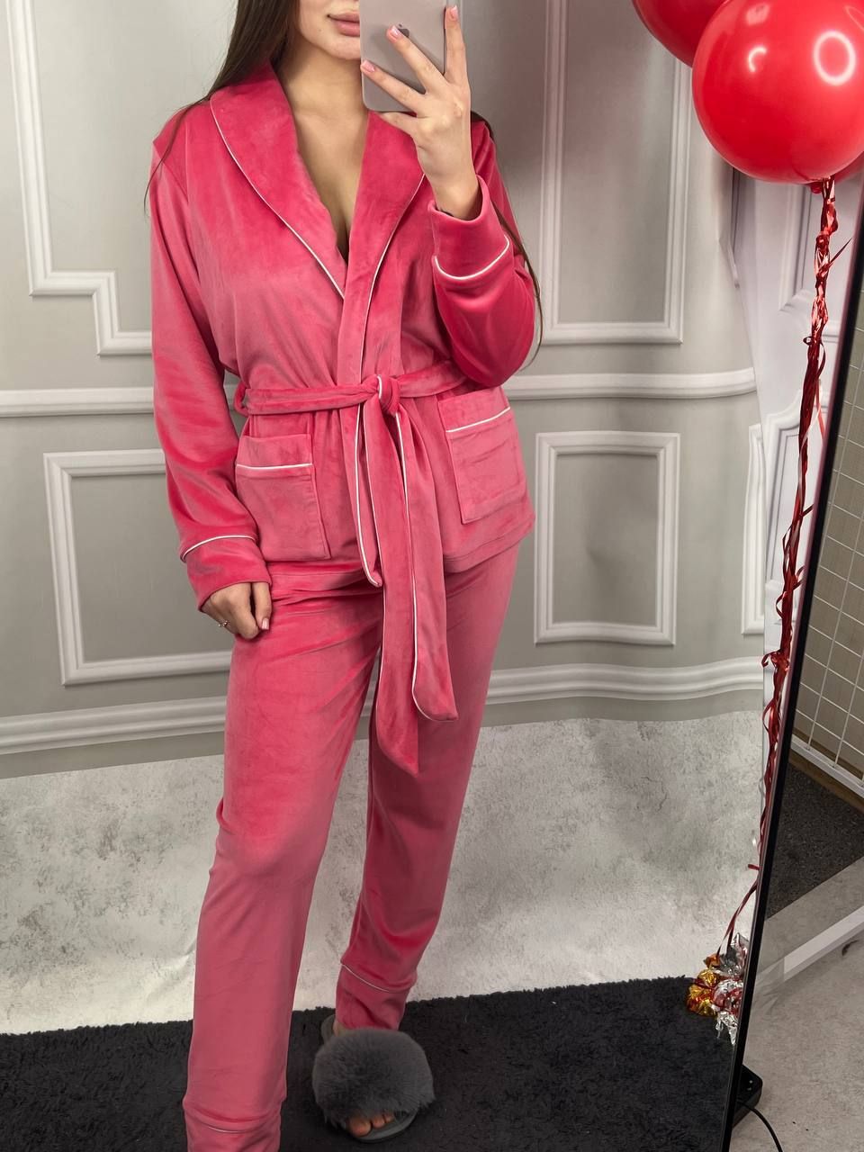 Жіночий домашній костюм велюровий (штани і кофта під пояс) 065-21 корал