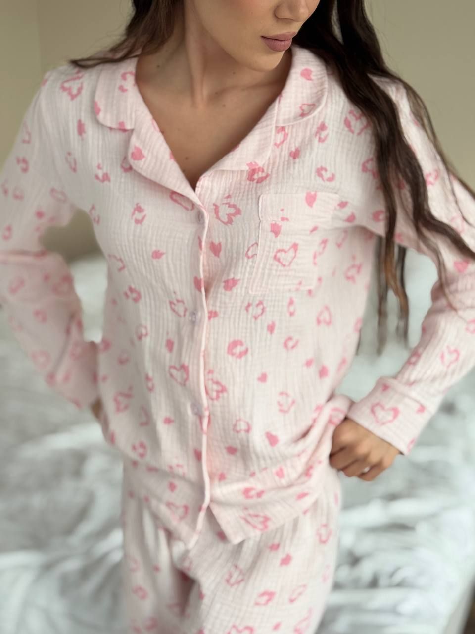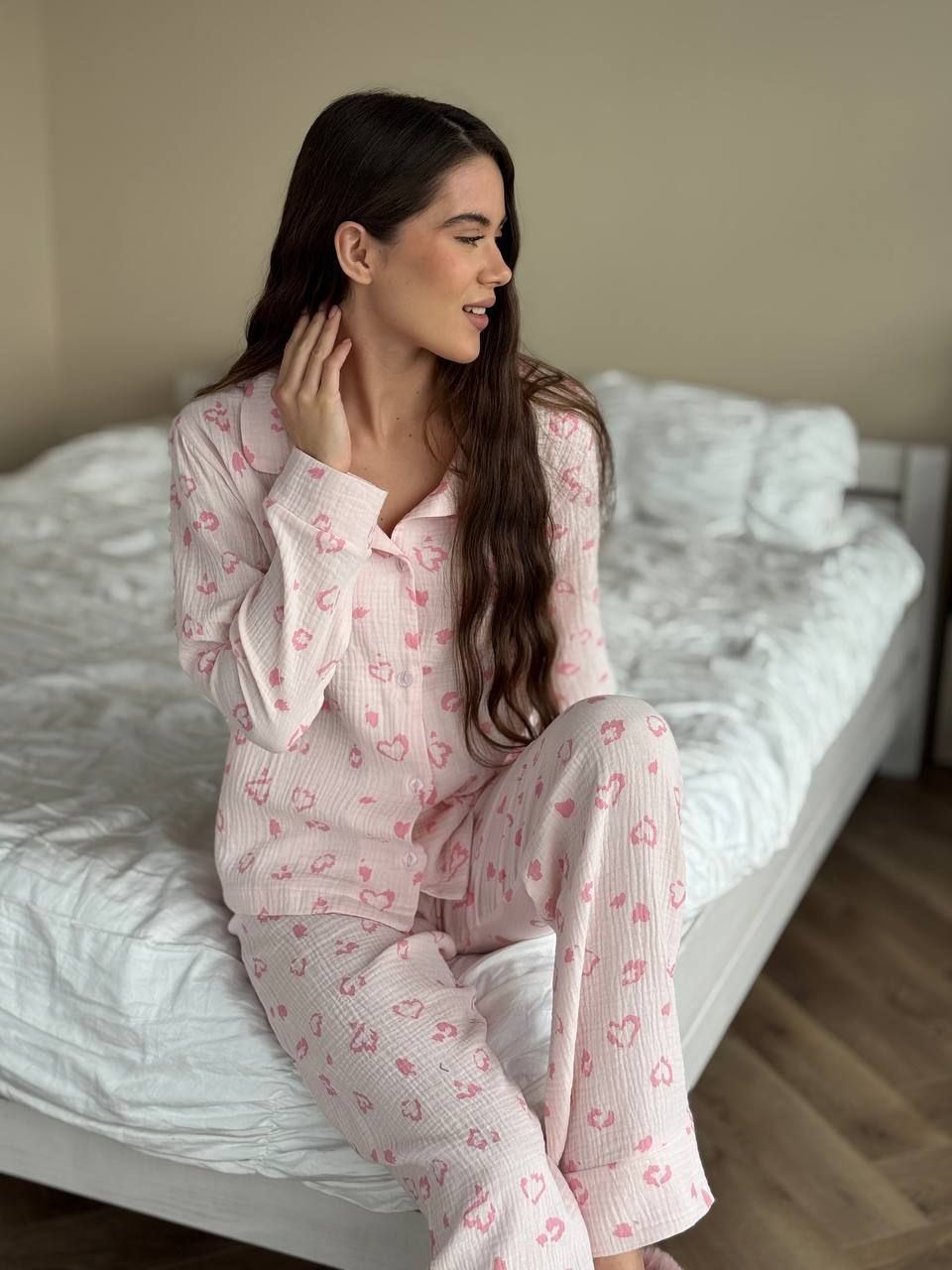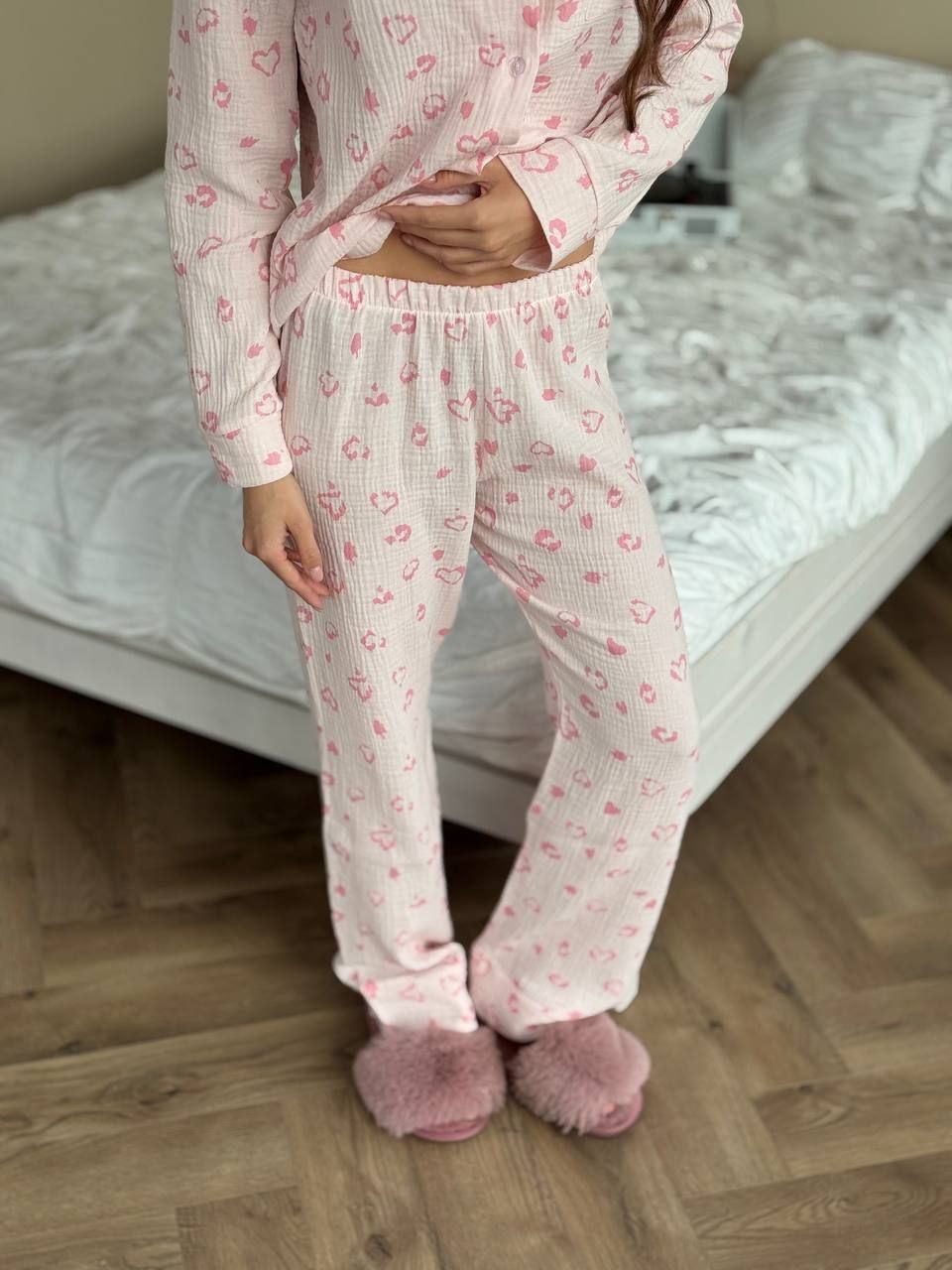 Стильний костюм із високоякісного мусліну в трендовому оверсайз крої, що дарує комфорт і свободу рухів. Підійде для дівчат з будь-якою фігурою. Ніжна, дихаюча тканина приємна до тіла та забезпечує максимальний комфорт у будь-яку пору року. Сорочка на ґудзиках із накладною кишенькою. Прямі штани середньої посадки з прошитою одинарною резинкою. Ідеальний вибір для домашнього затишку, прогулянок чи подорожей.