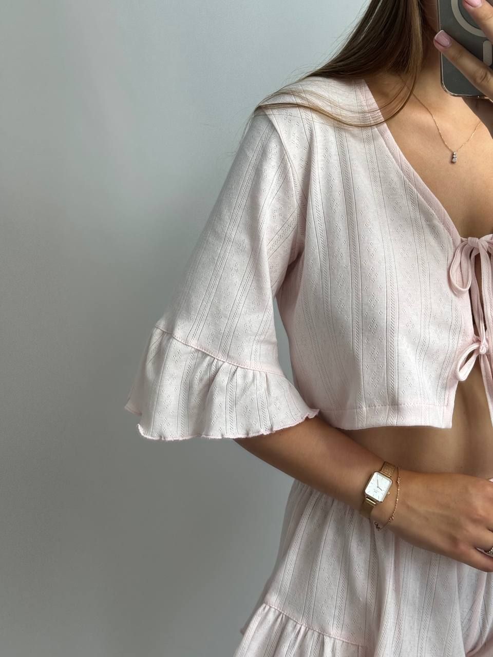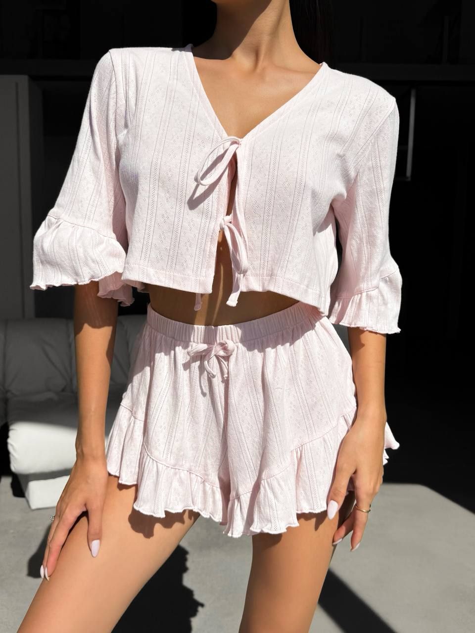 Соблазнительная трикотажная пижама на завязках — стильный и комфортный комплект для домашнего отдыха. Укороченная свободная кофточка с оригинальным передом на завязках подчеркивает женственность, а рукава с рюшами добавляют образу легкости и романтичности. Шортики с высокой посадкой имеют свободный крой и украшены рюшами, что обеспечивает максимальный комфорт и привлекательный вид. Идеальный выбор для уютных вечеров и красивых домашних образов.